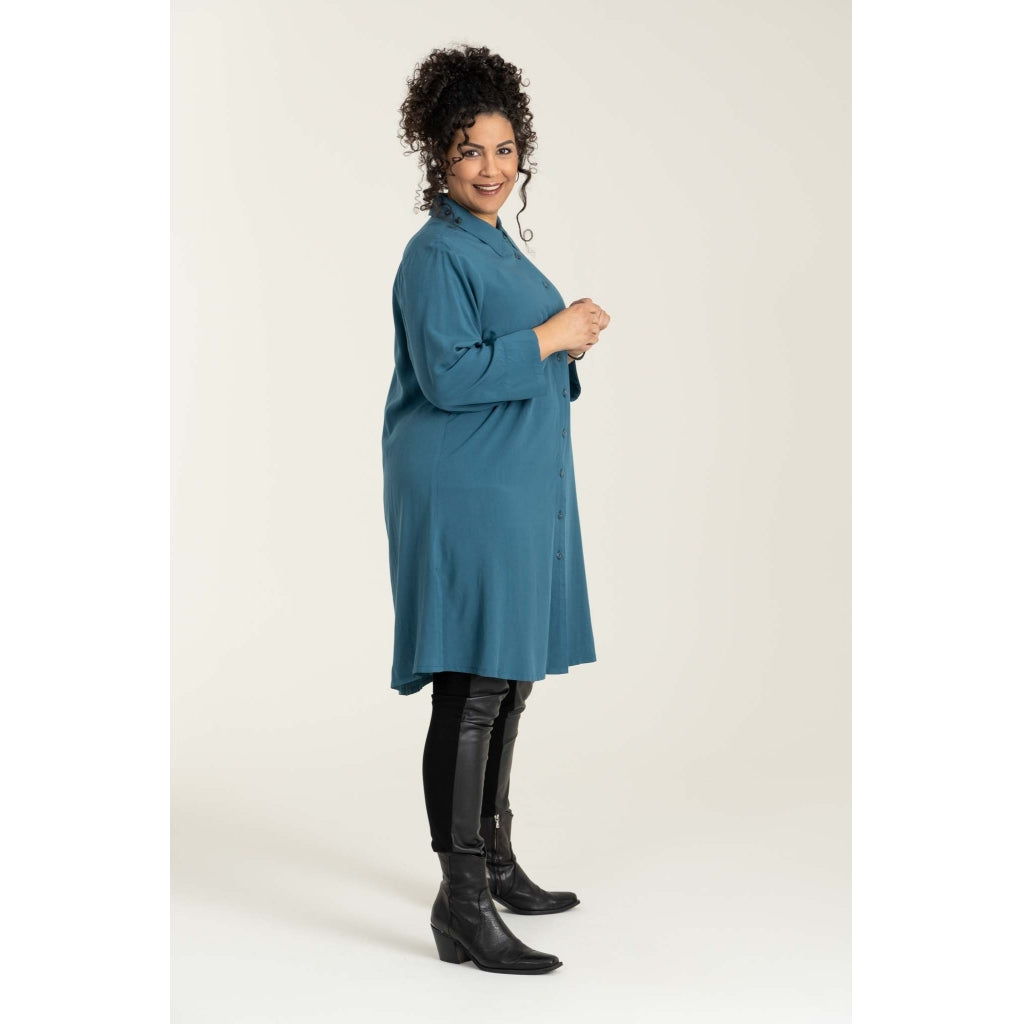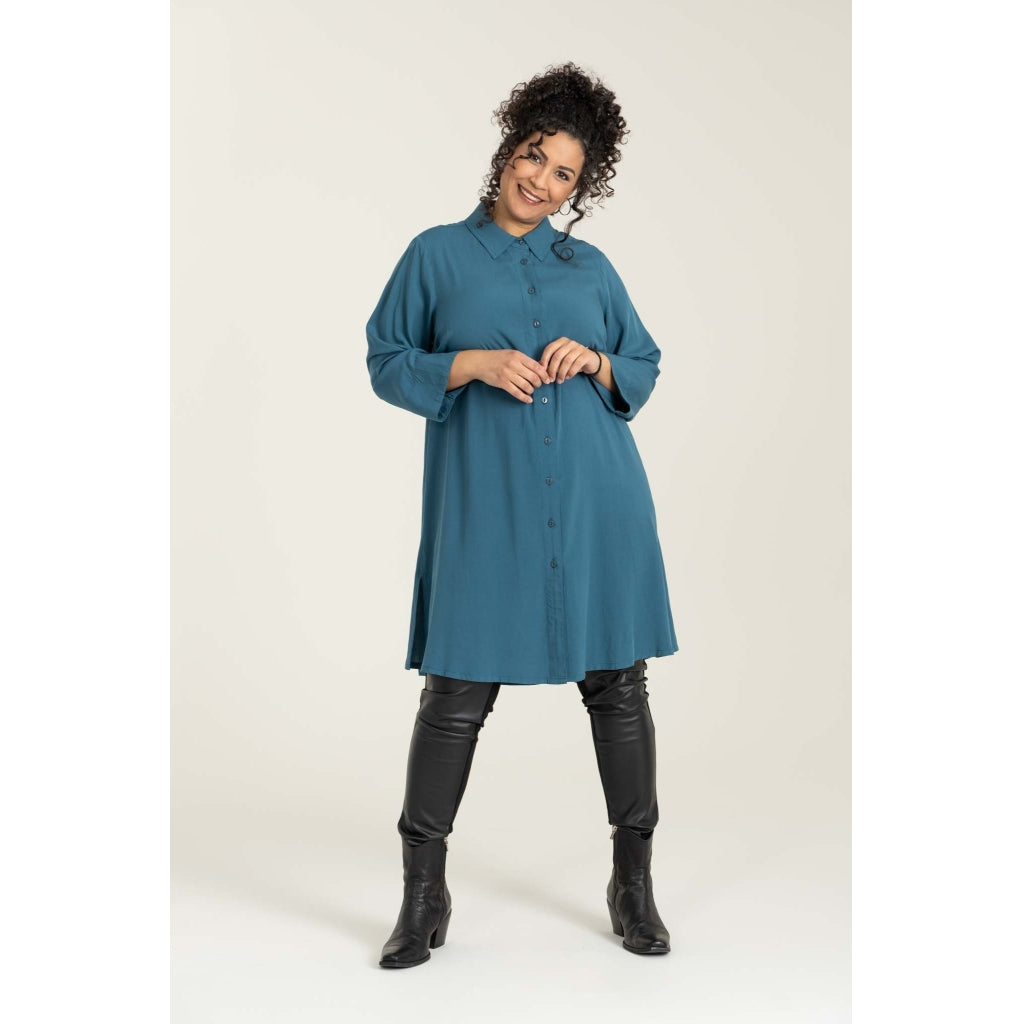 Feminin lang skjorte i ensfarvet viskose af høj kvalitet. Flatterende A-facon med skjortekrave og brede 7/8 ærmer. Dekorativ dobbeltlagsfold i ryggen og gennemgående knaplukning foran.