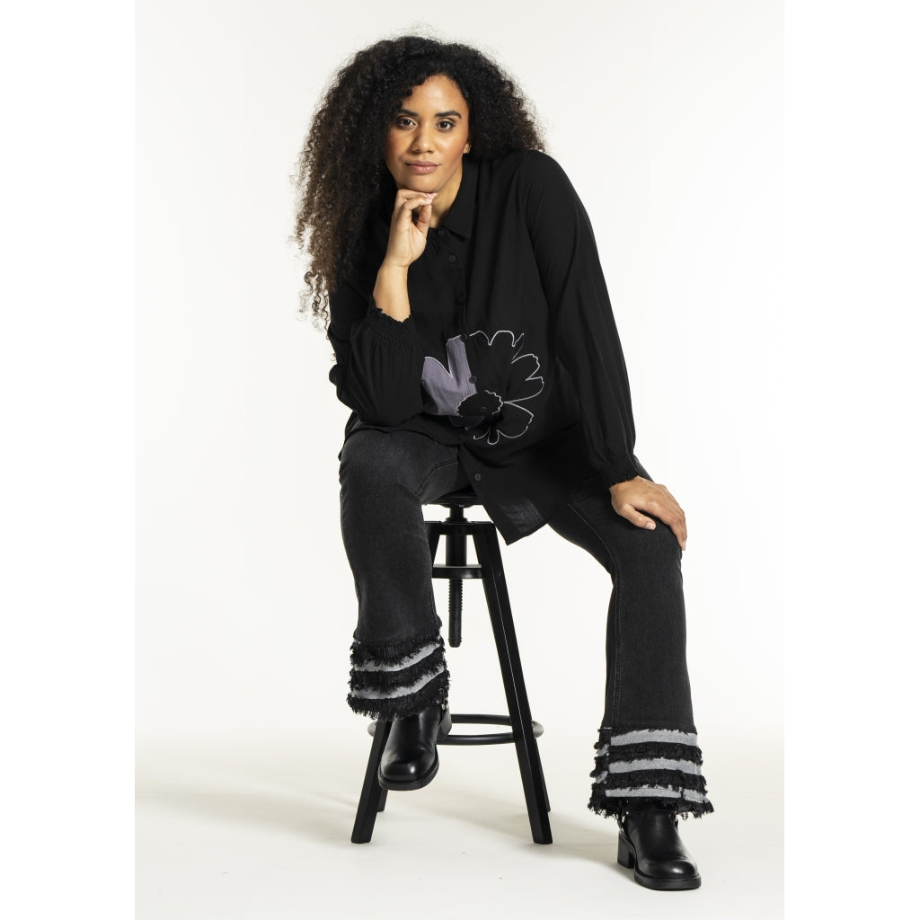 Sort skjorte i 100% viskose med frontmotiv af blomst i kontrastfarve. Skjorten har en afslappet pasform og er designet med klassisk skjortekrave og gennemgående knaplukning. Ærmerne afsluttes med brede smockmanchetter. Ryggen er udstyret med bærestykke og dekorativ split-læg.