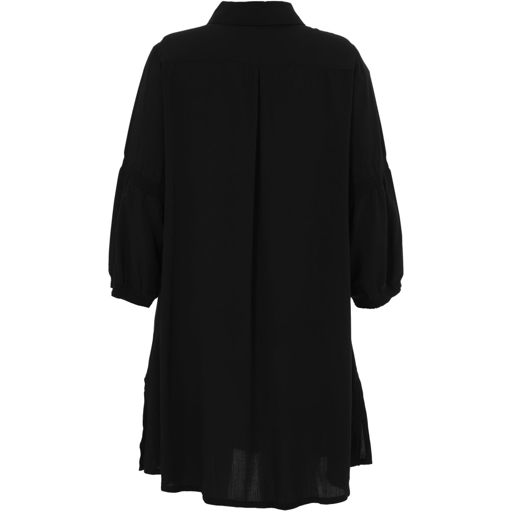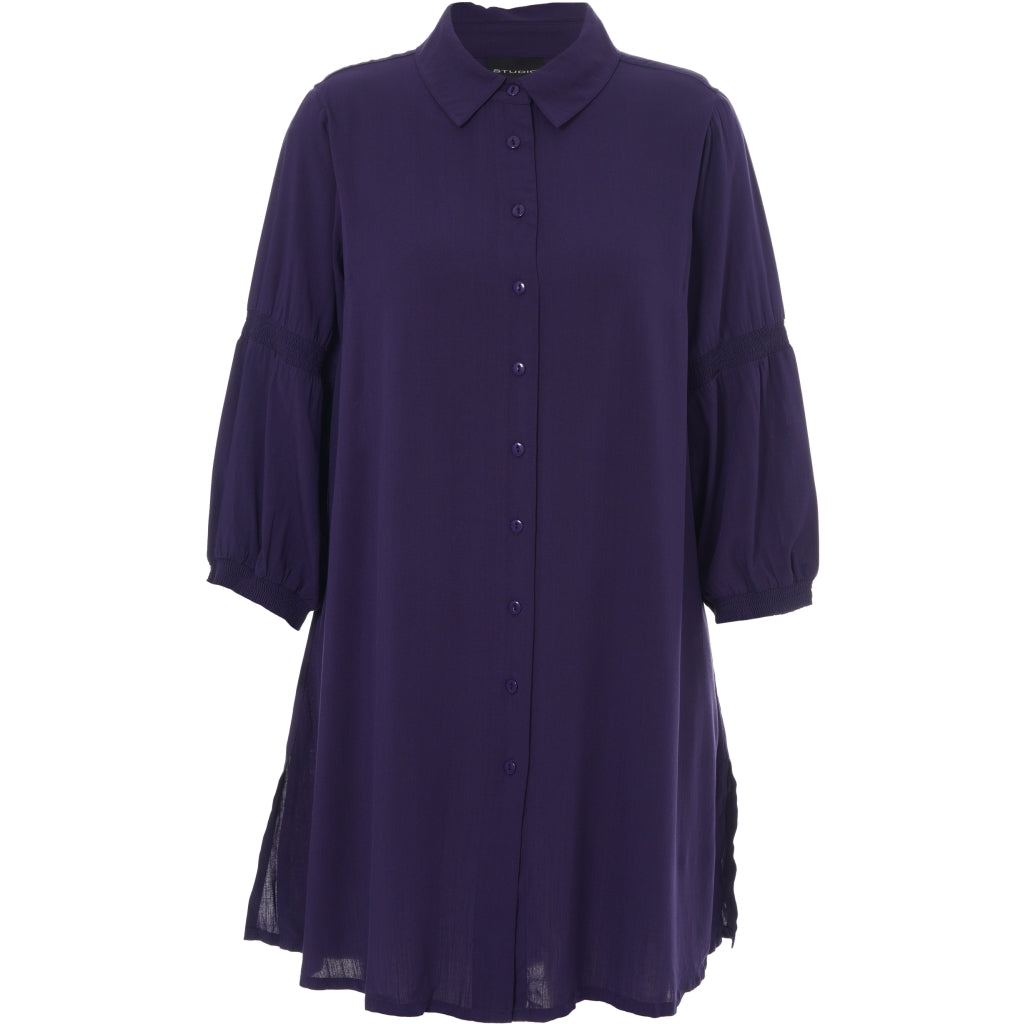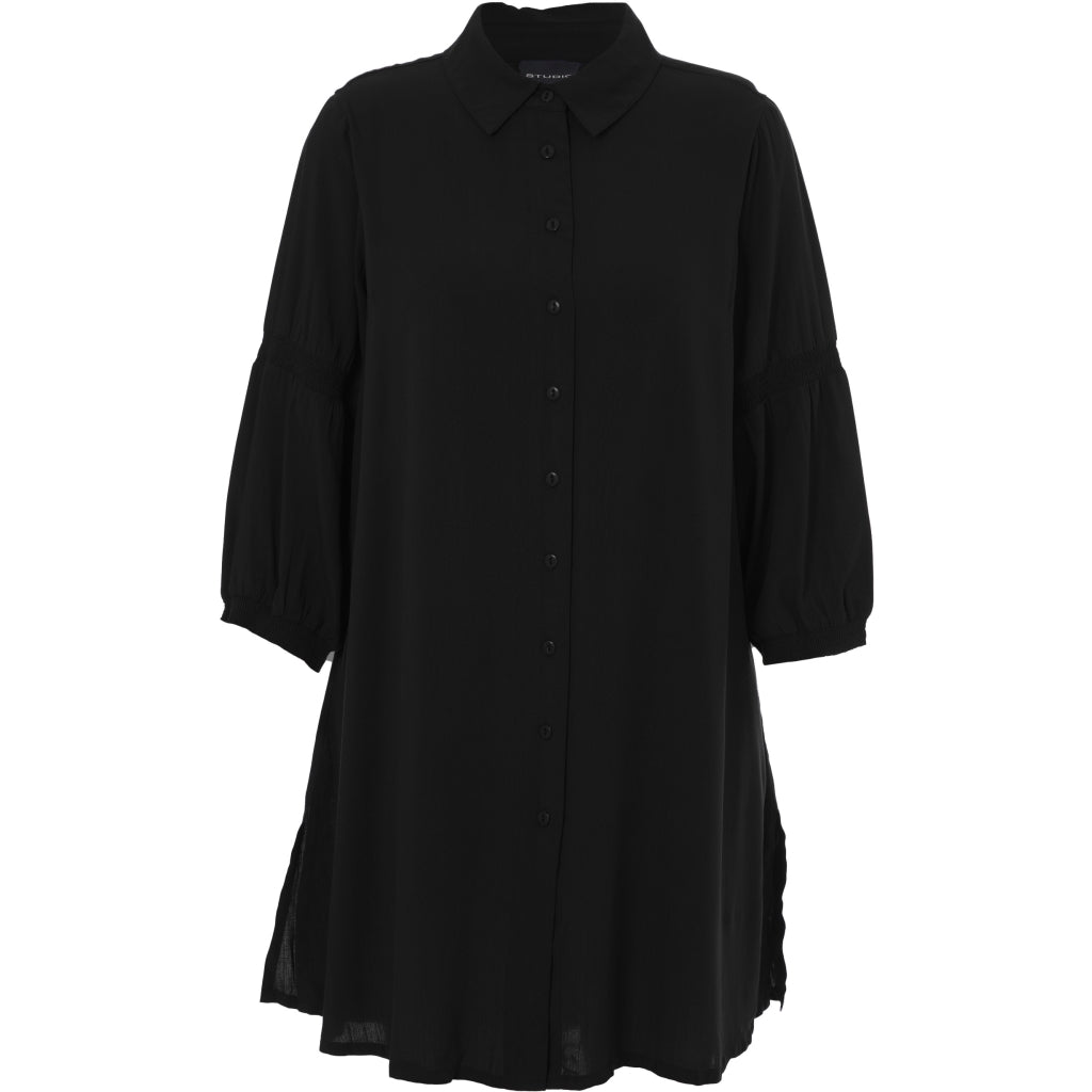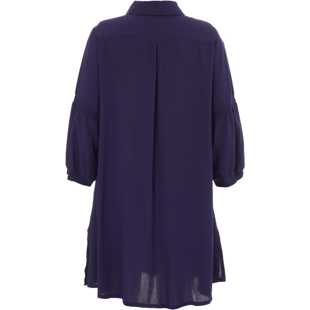 Skøn, ensfarvet skjorte i 100% viskose med fine detaljer. Skjortekrave, gennemgående knaplukning og lange ærmer med smockdetalje over albuen samt kort smockmanchet.