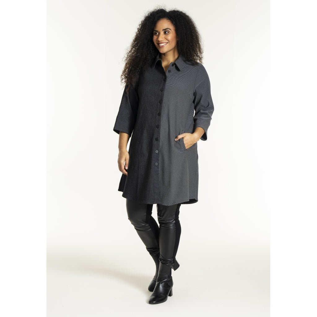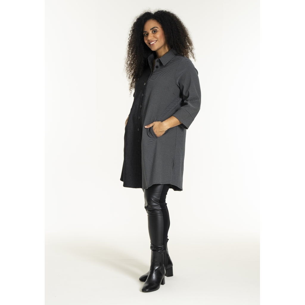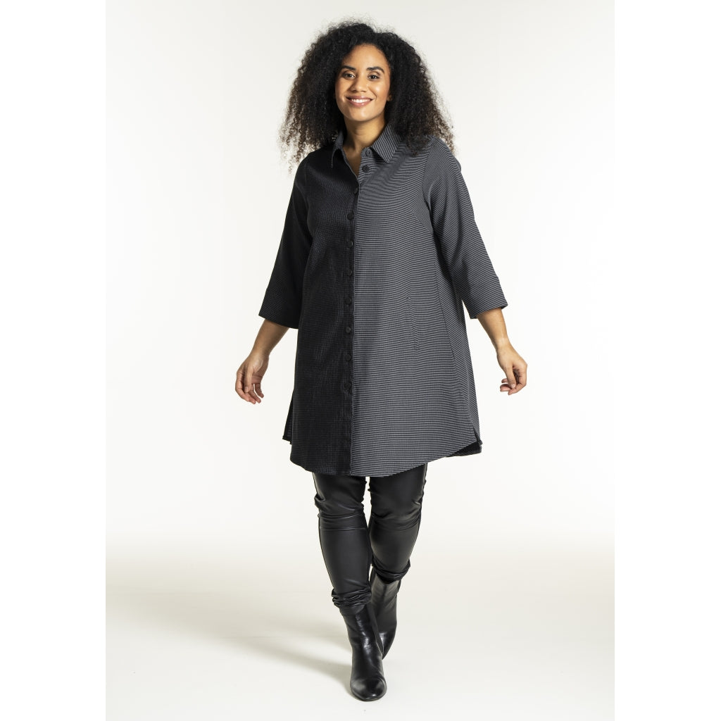 Fin skjorte i elastisk viskose-polyester mix i småt ternet mønster i to kontrastfarver. Skjorten har en klassisk skjortekrave og gennemgående knaplukning foran med knapper. Stylen har 3/4 lange ærmer og et let A-formet snit.