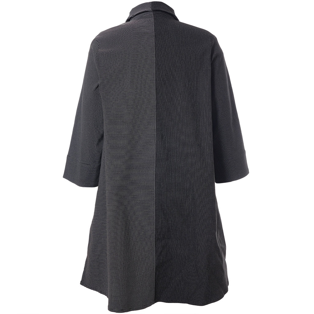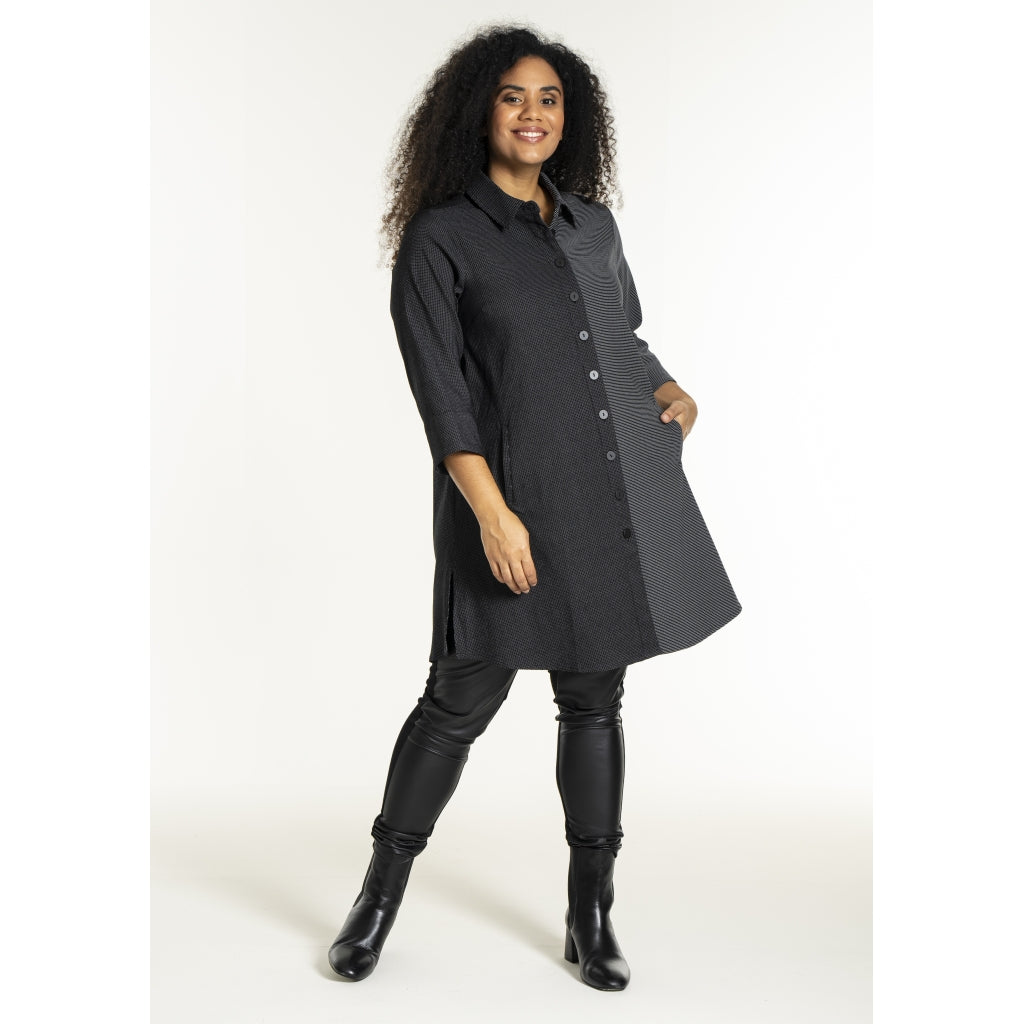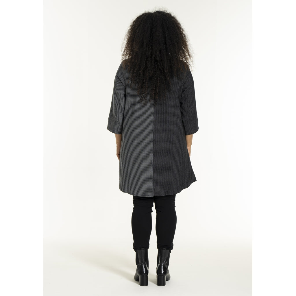 Fin skjorte i elastisk viskose-polyester mix i småt ternet mønster i to kontrastfarver. Skjorten har en klassisk skjortekrave og gennemgående knaplukning foran med knapper. Stylen har 3/4 lange ærmer og et let A-formet snit.