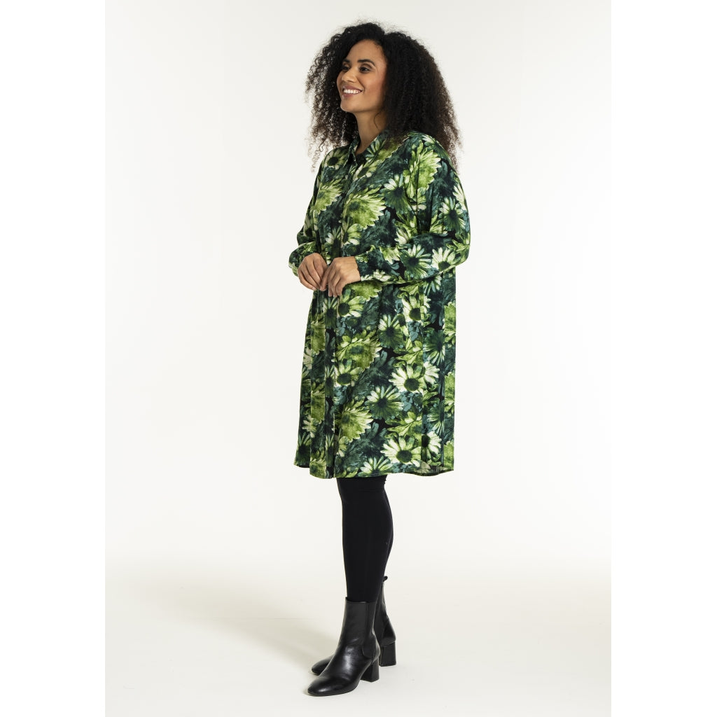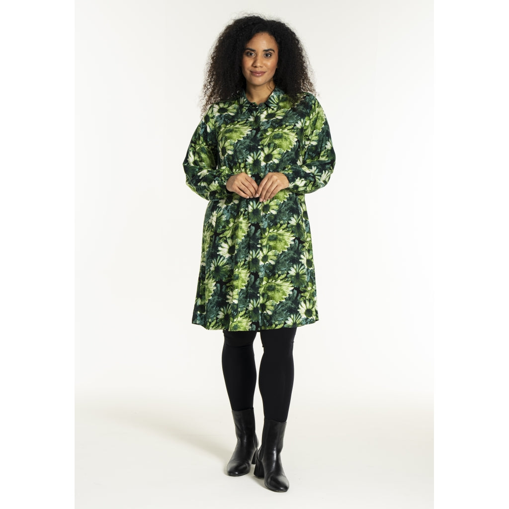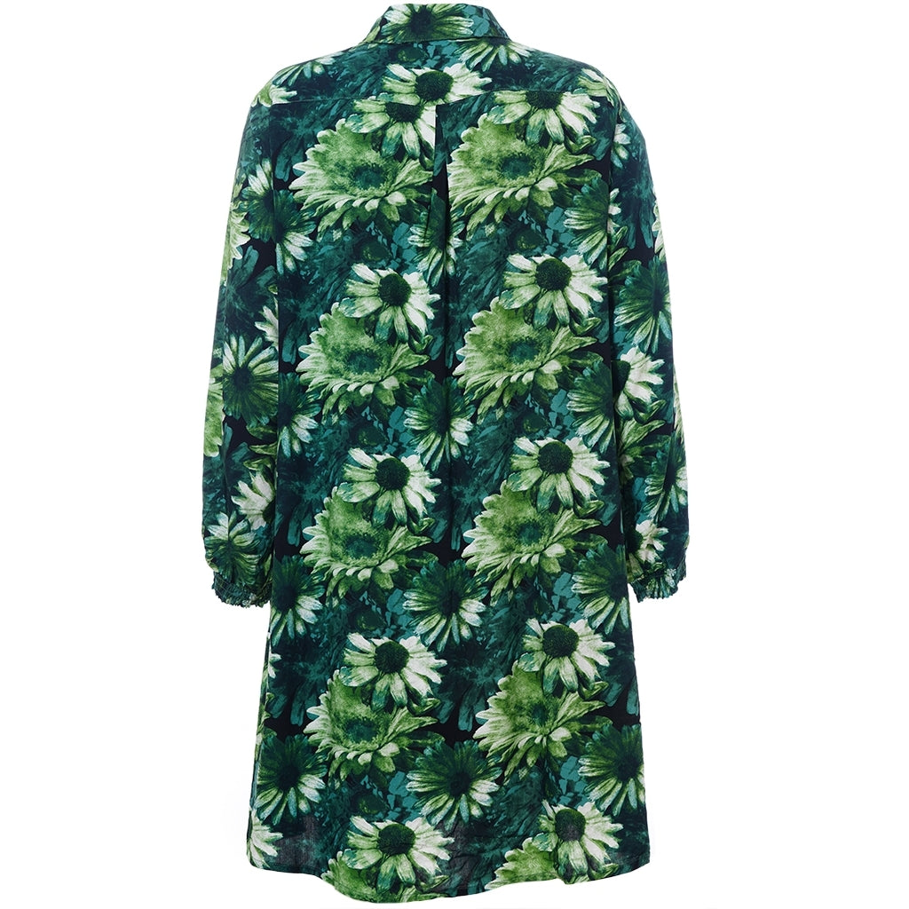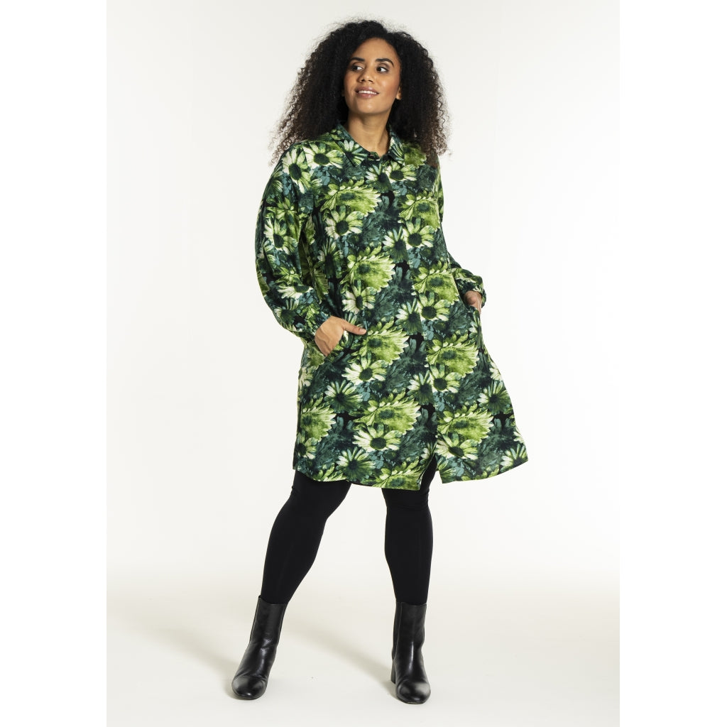 Lang skjorte med blomsterprint i grønne toner med naturinspireret udtryk. Skjorten er 100% viskose med klassisk skjortekrave og skjult knaplukning hele vejen ned foran. Ærmerne er lange og afsluttes med en smockmanchet.