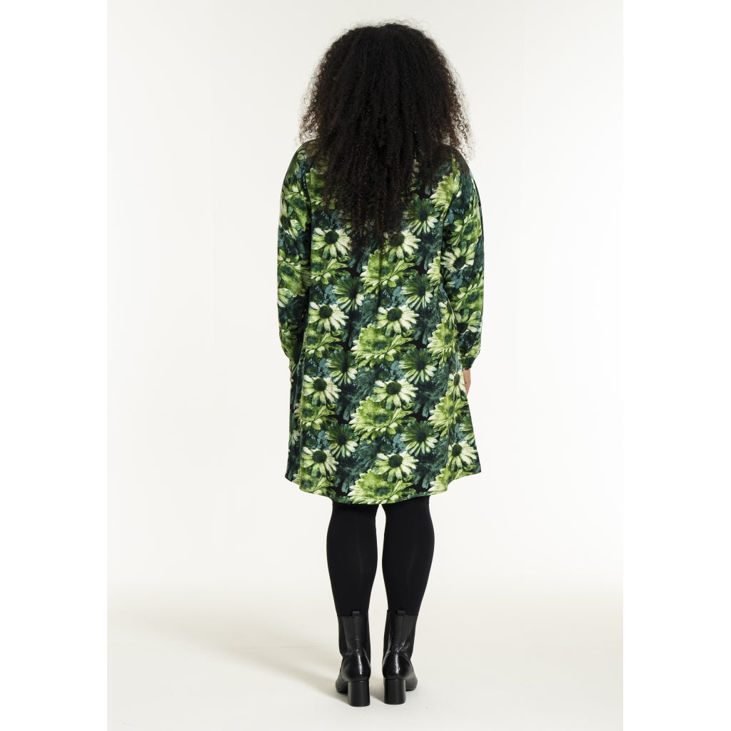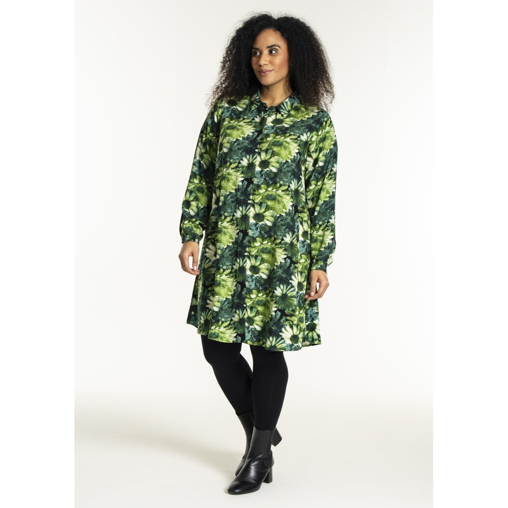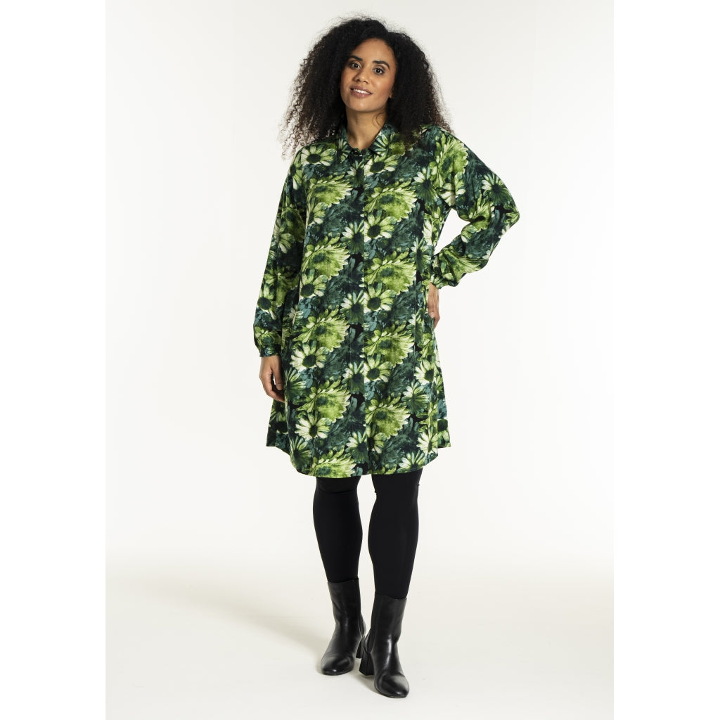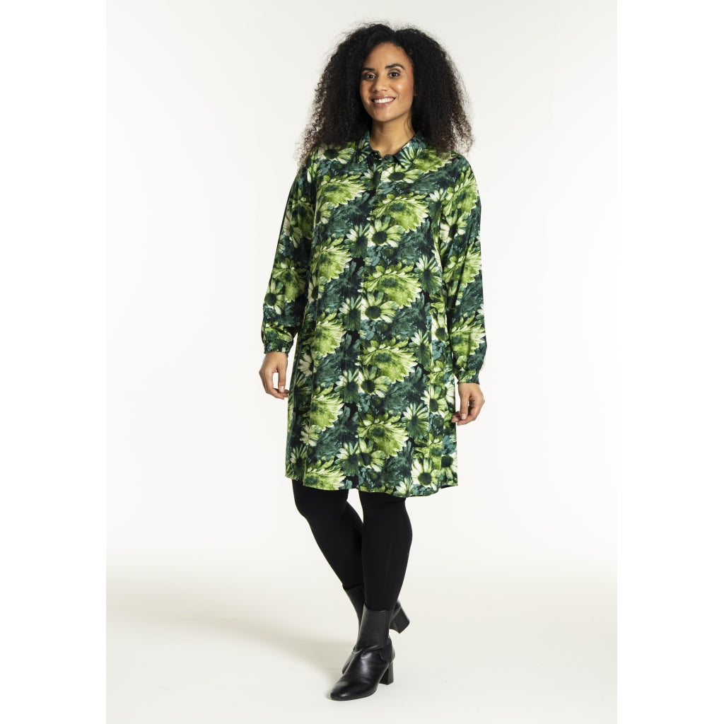 Lang skjorte med blomsterprint i grønne toner med naturinspireret udtryk. Skjorten er 100% viskose med klassisk skjortekrave og skjult knaplukning hele vejen ned foran. Ærmerne er lange og afsluttes med en smockmanchet.