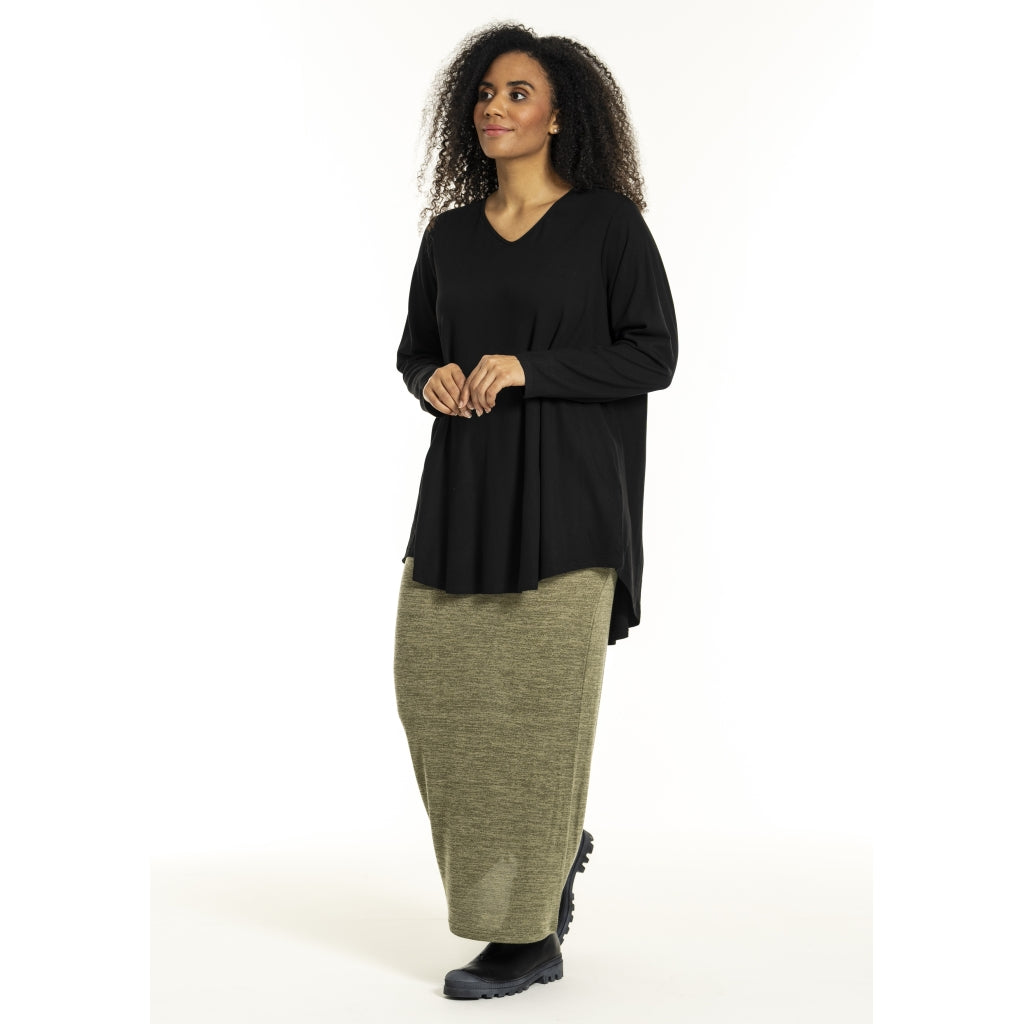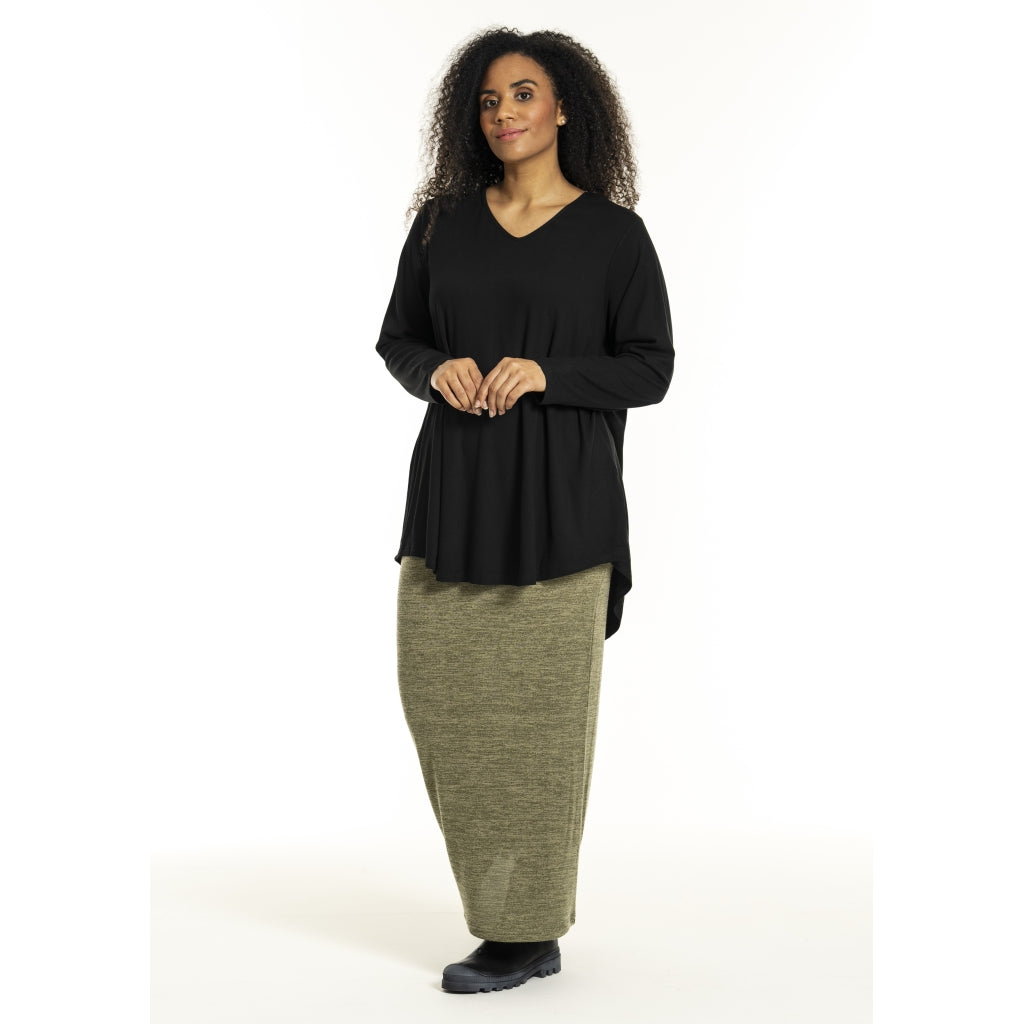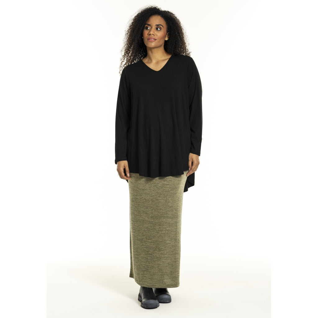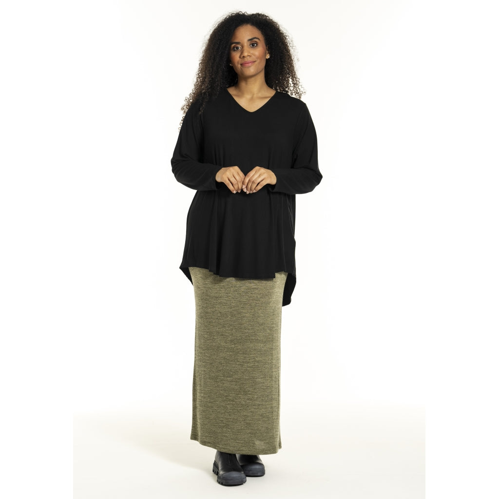 Fin, tætsiddende nederdel i elastisk viskose-polyester mix i ensfarvet, meleret farve. Tynd elastikbånd i taljen.