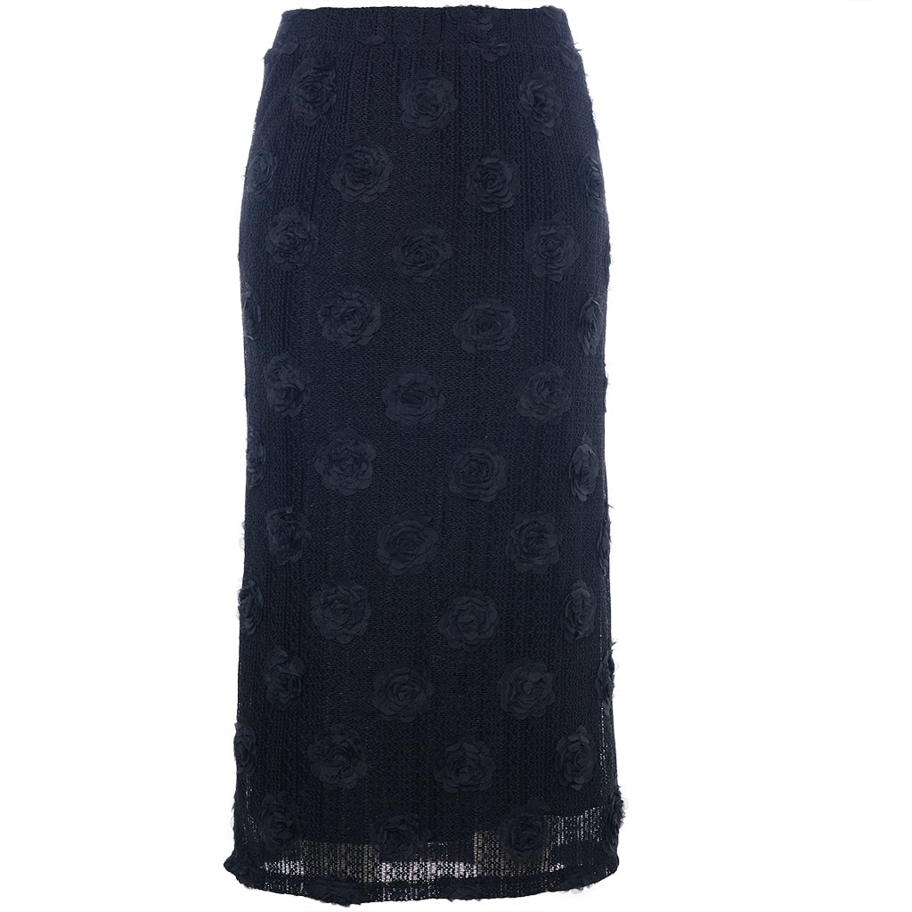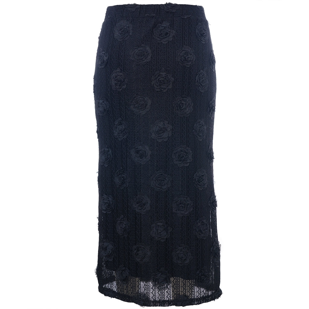 Elegant nederdel i sort ribbet mesh-kvalitet med tone-i-tone blomsterbroderi og struktur. Nederdelen er med viskose-elastane linning i jerseykvalitet og klassisk, lige pasform. Med elastik i taljen.