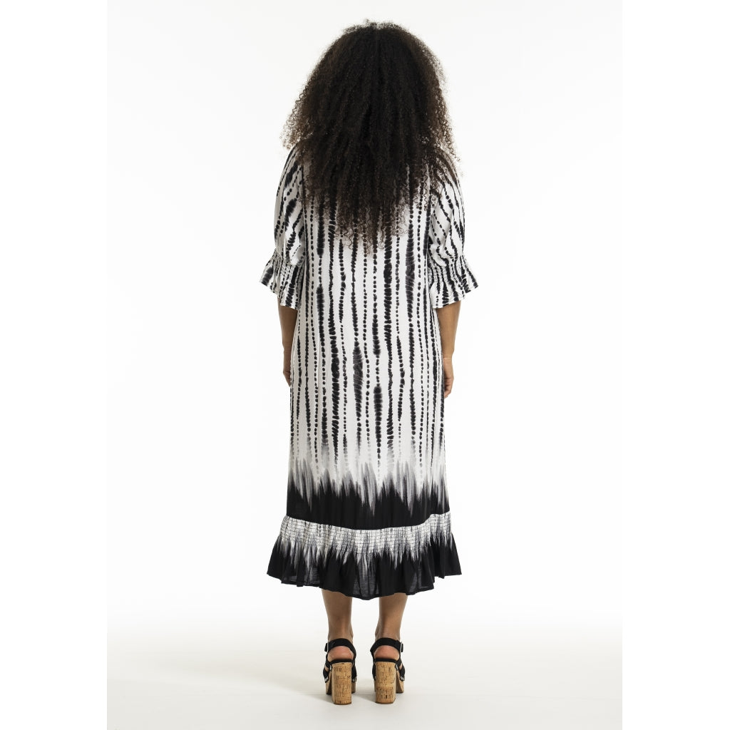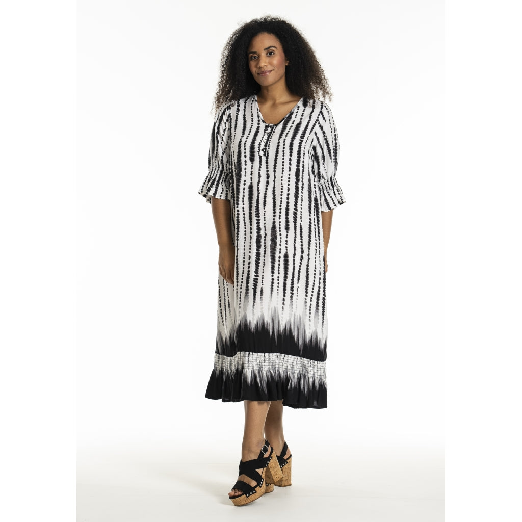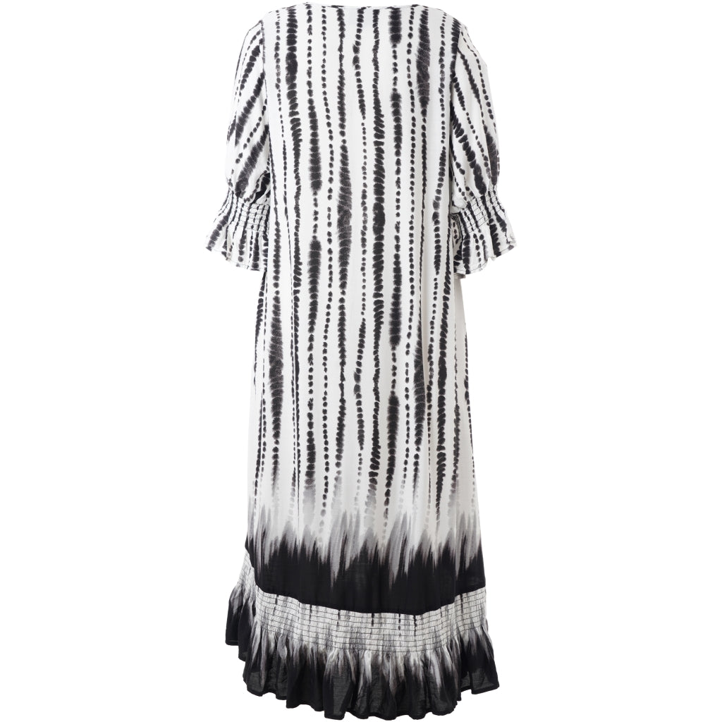 Lækker, lang kjole med sort/hvidt print i 100% viskose. Fin dyb V-halsudskæring med kort knap-detalje ned til brystet. 3/4 ærmer med smock og flæsekant, der matcher bunden af kjole, da den også har smock og flæsekant.