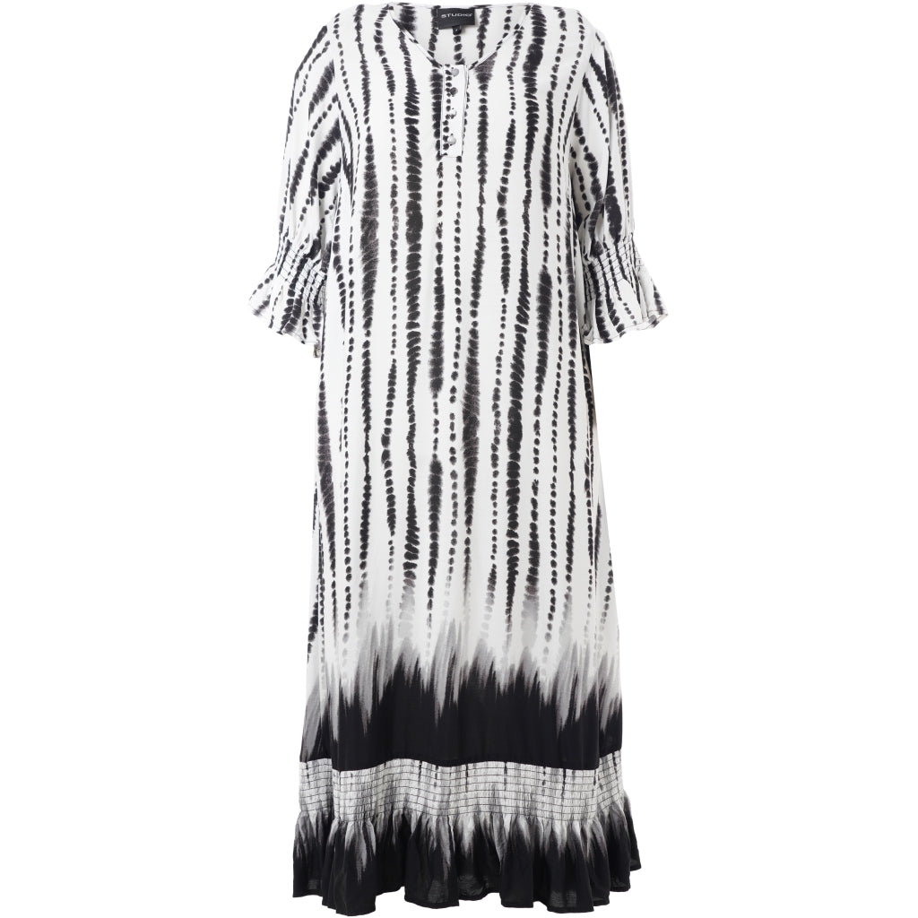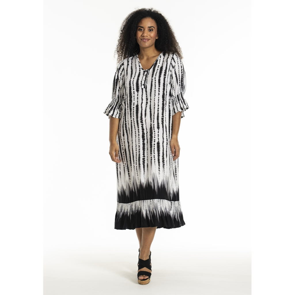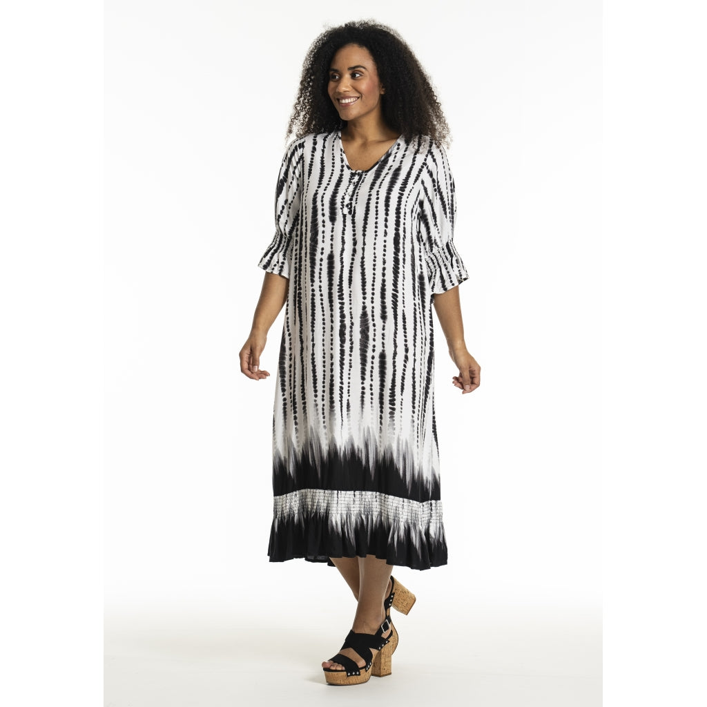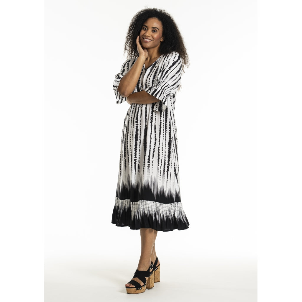Lækker, lang kjole med sort/hvidt print i 100% viskose. Fin dyb V-halsudskæring med kort knap-detalje ned til brystet. 3/4 ærmer med smock og flæsekant, der matcher bunden af kjole, da den også har smock og flæsekant.