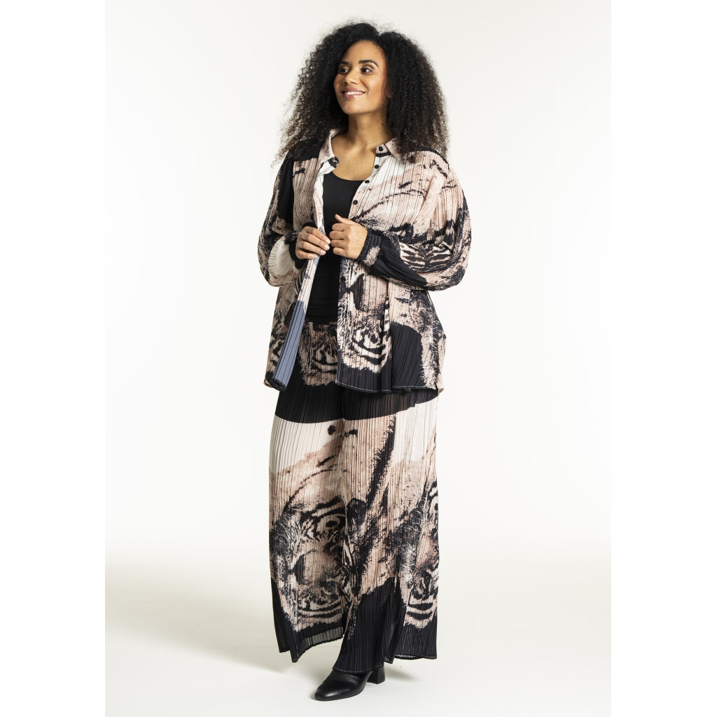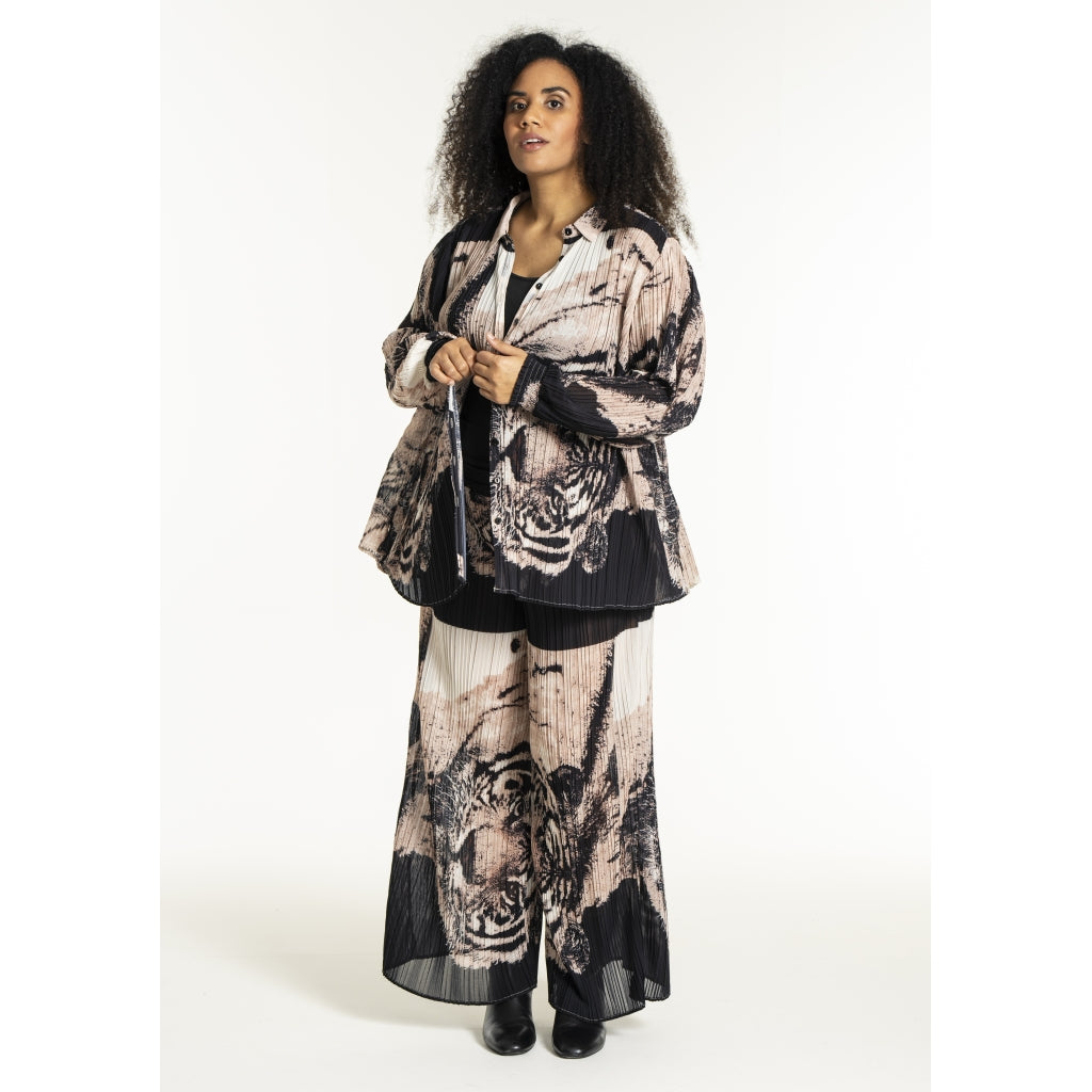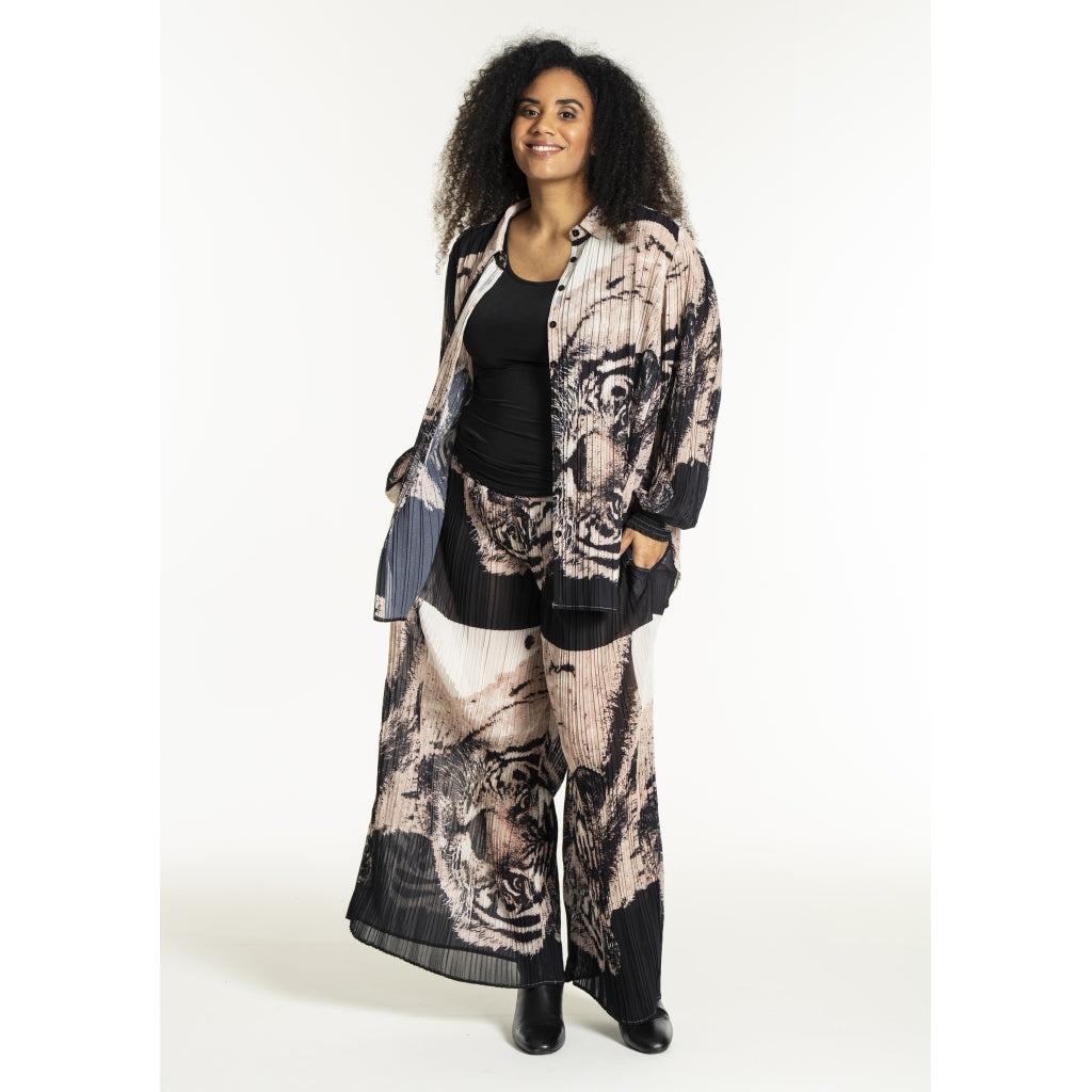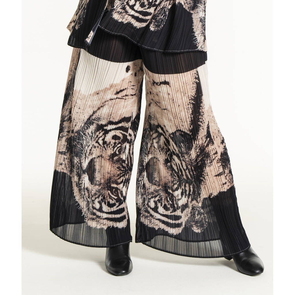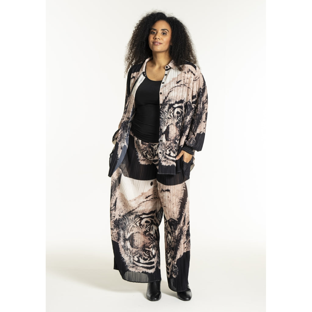 Et par fede, plisserede bukser med iøjnefaldende tigerprint i beige, sorte og hvide nuancer, der skaber et moderne patchwork-udtryk. Pasformen er løs med elastisk talje, hvilket gør dem behagelige at have på. Med sidelommer.