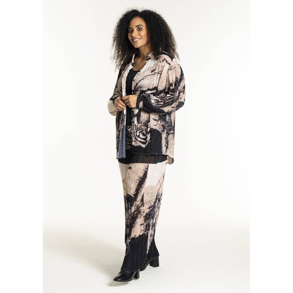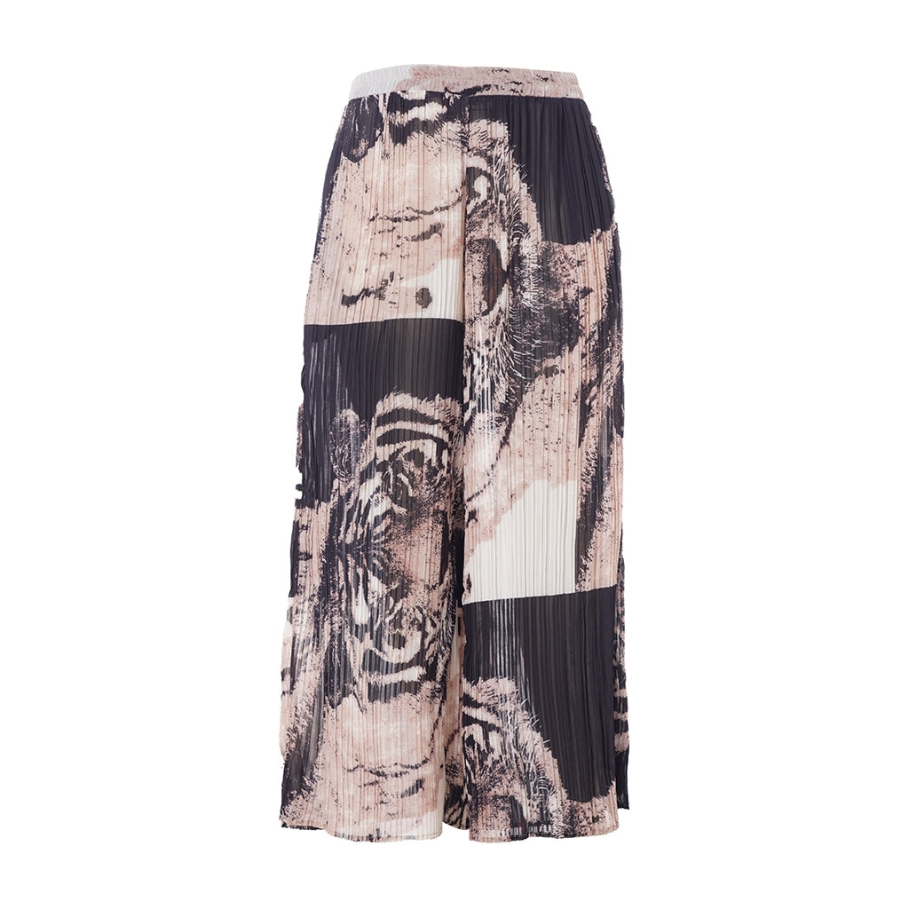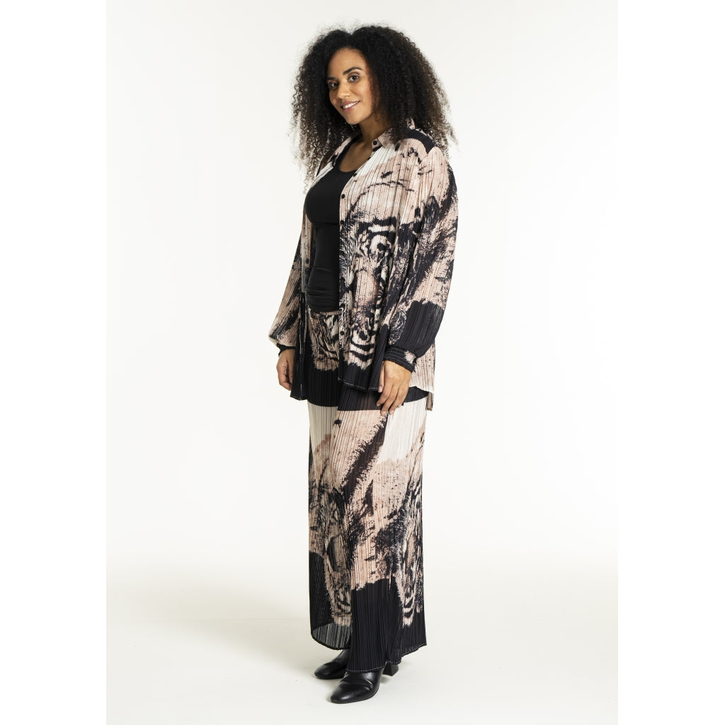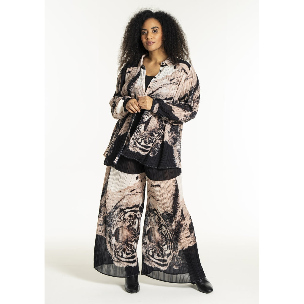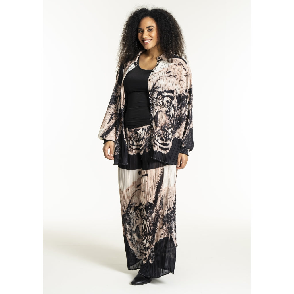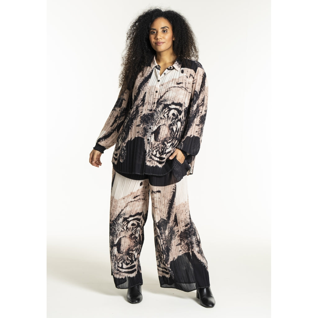 Et par fede, plisserede bukser med iøjnefaldende tigerprint i beige, sorte og hvide nuancer, der skaber et moderne patchwork-udtryk. Pasformen er løs med elastisk talje, hvilket gør dem behagelige at have på. Med sidelommer.