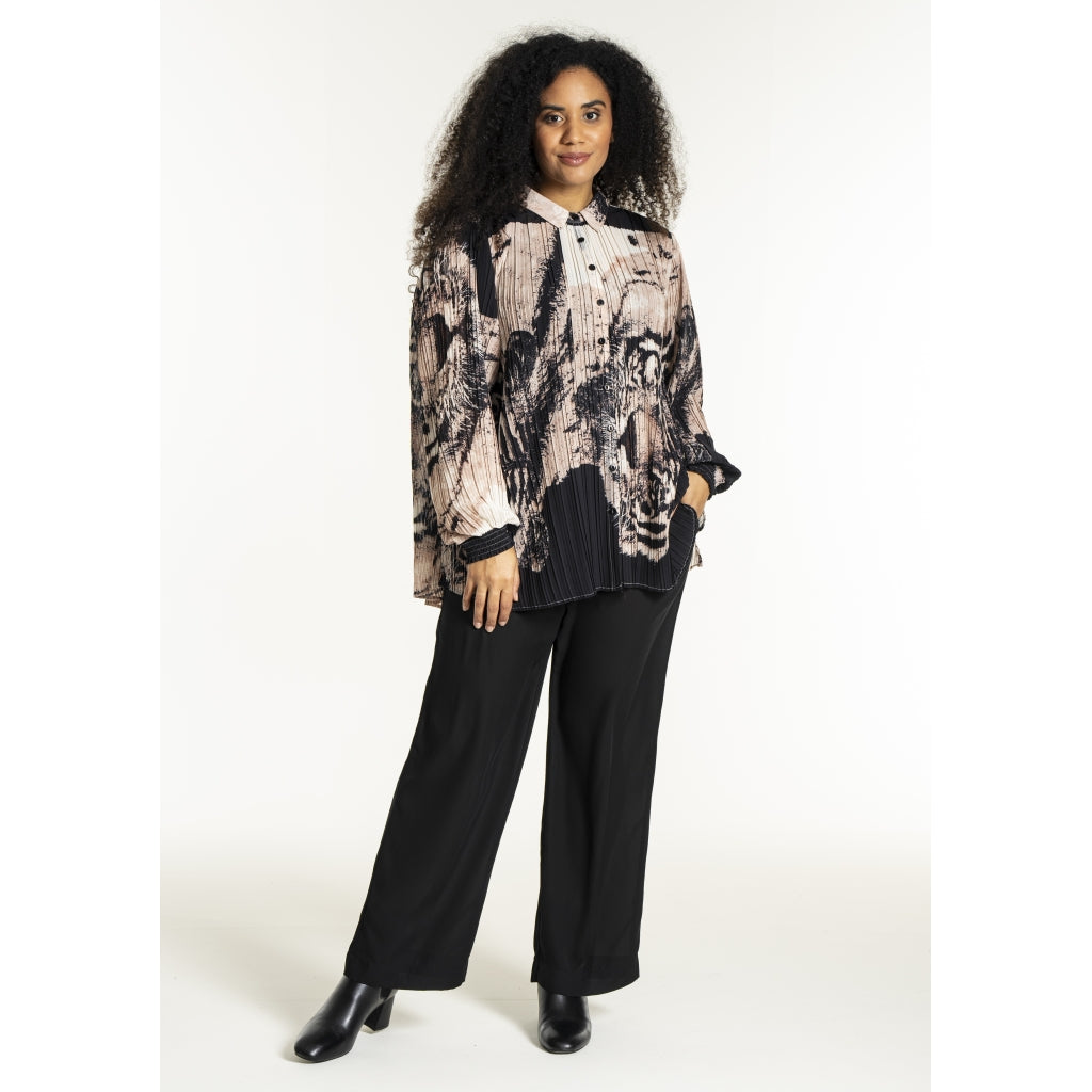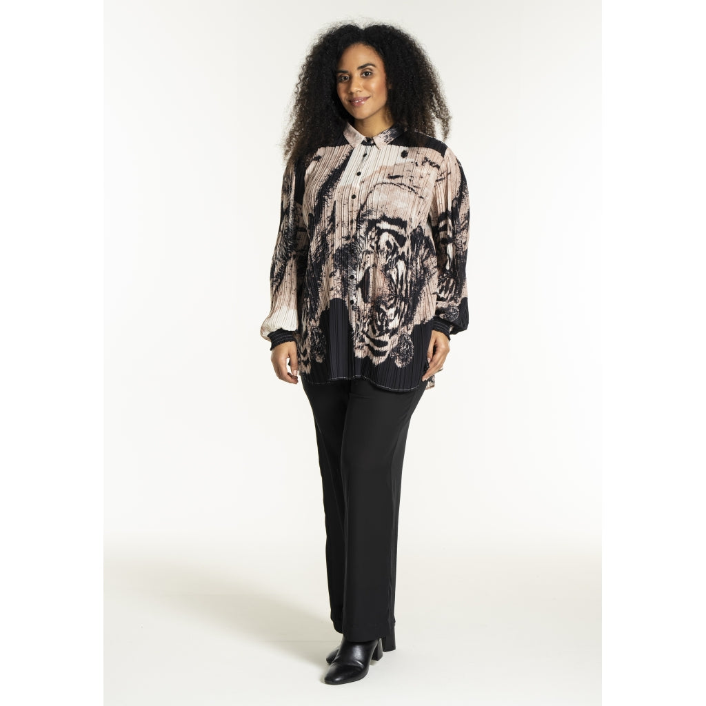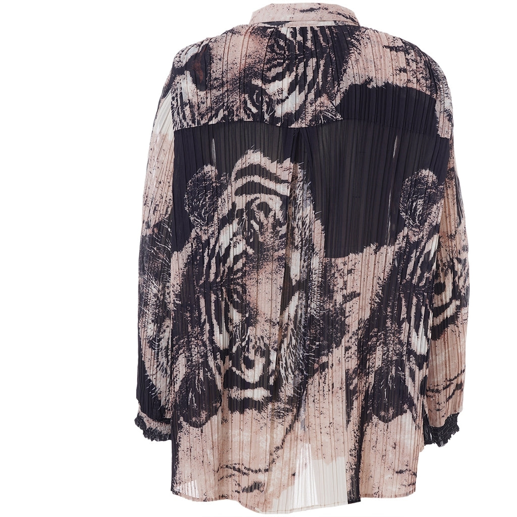 Flot, plisseret skjorte med flot print i sort, beige og offwhite nuancer med tigeransigter i kunstnerisk collageeffekt. Skjorten har en løs og afslappet pasform, som understreges af det lette, plisserede materiale. Den har klassisk skjortekrave, gennemgående knaplukning og lange ærmer med smockdetaljer ved manchetterne, som skaber en blød rynkeeffekt.
