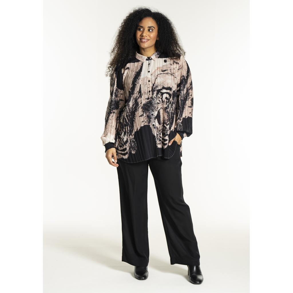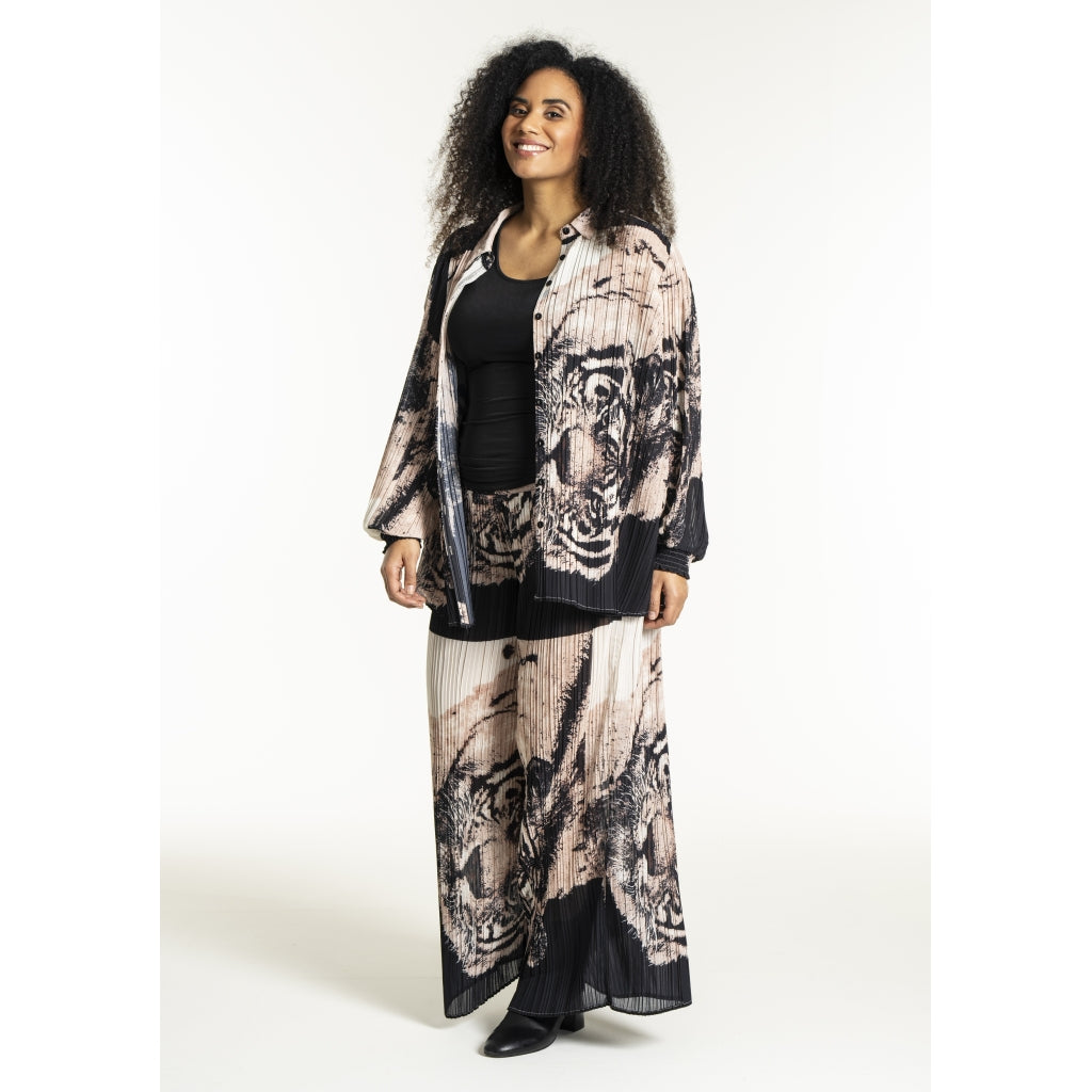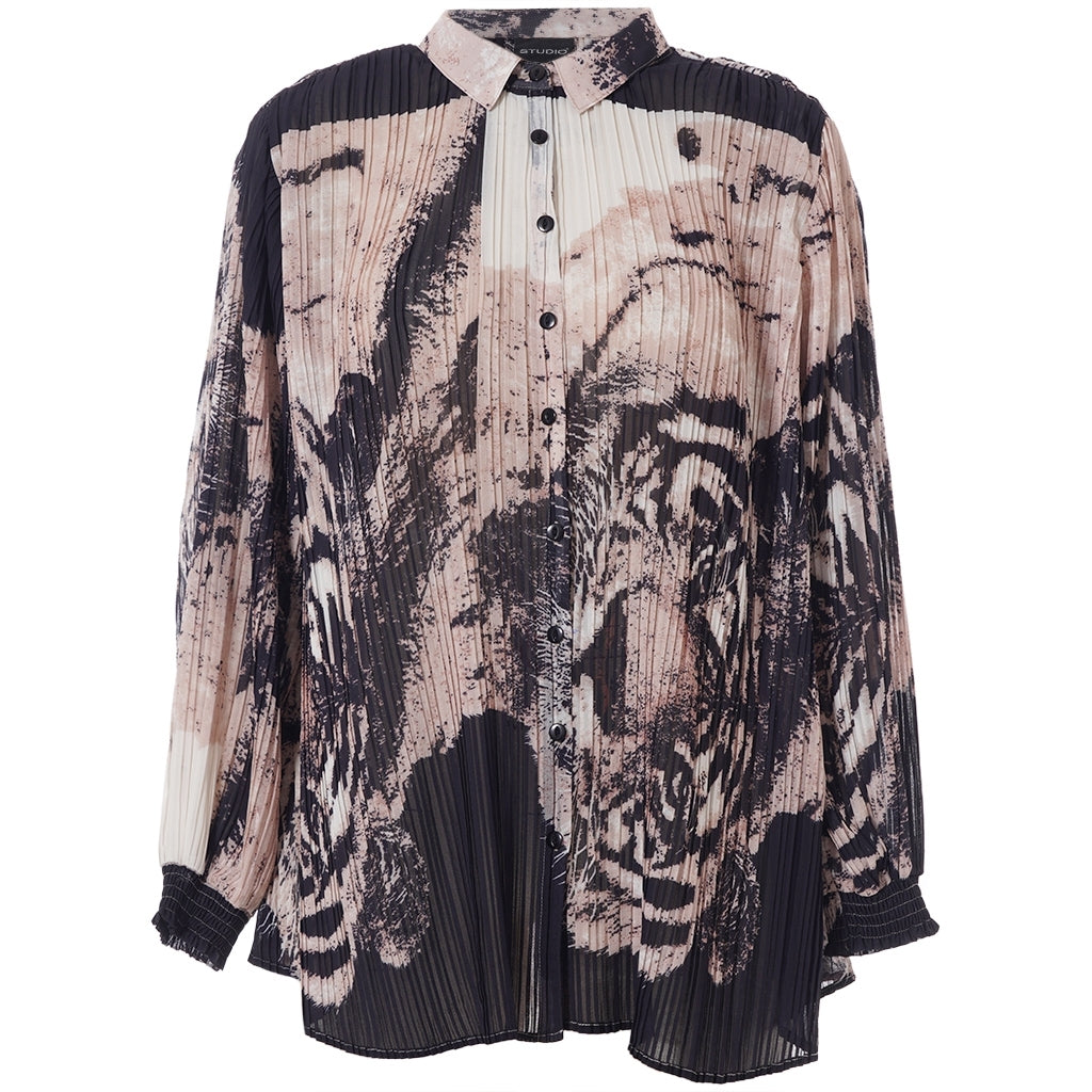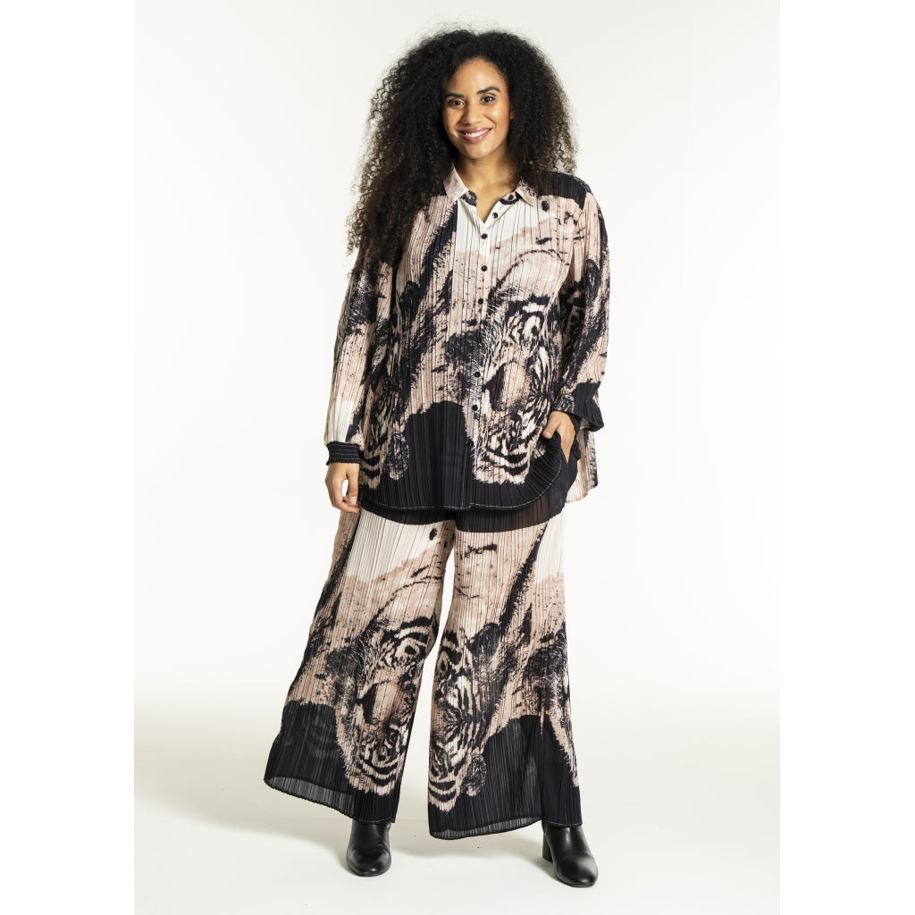 Flot, plisseret skjorte med flot print i sort, beige og offwhite nuancer med tigeransigter i kunstnerisk collageeffekt. Skjorten har en løs og afslappet pasform, som understreges af det lette, plisserede materiale. Den har klassisk skjortekrave, gennemgående knaplukning og lange ærmer med smockdetaljer ved manchetterne, som skaber en blød rynkeeffekt.