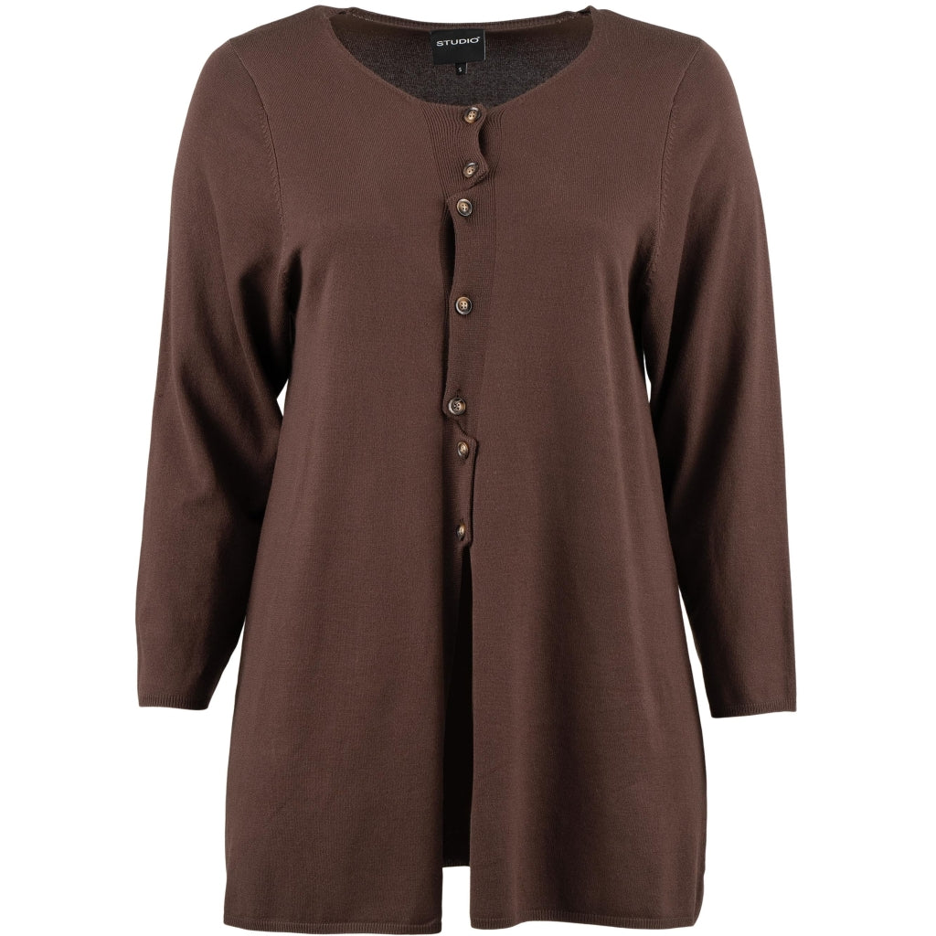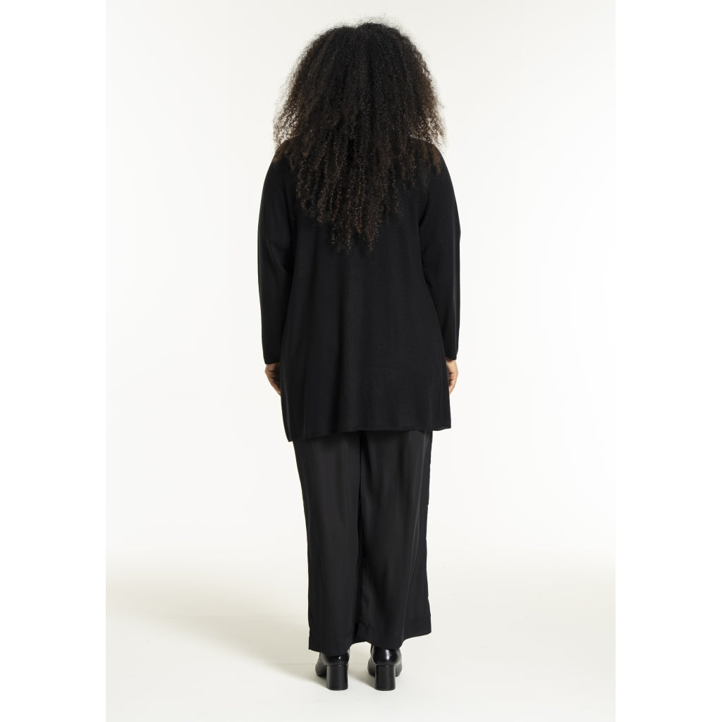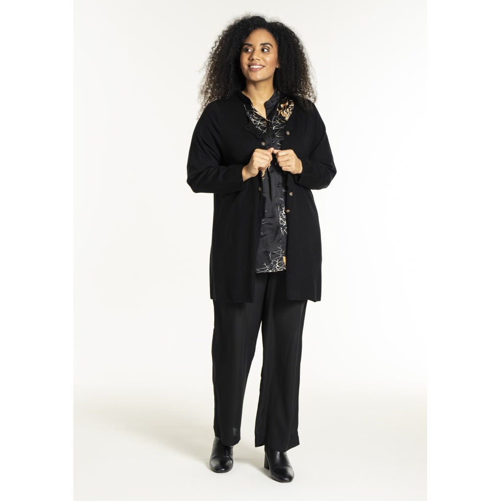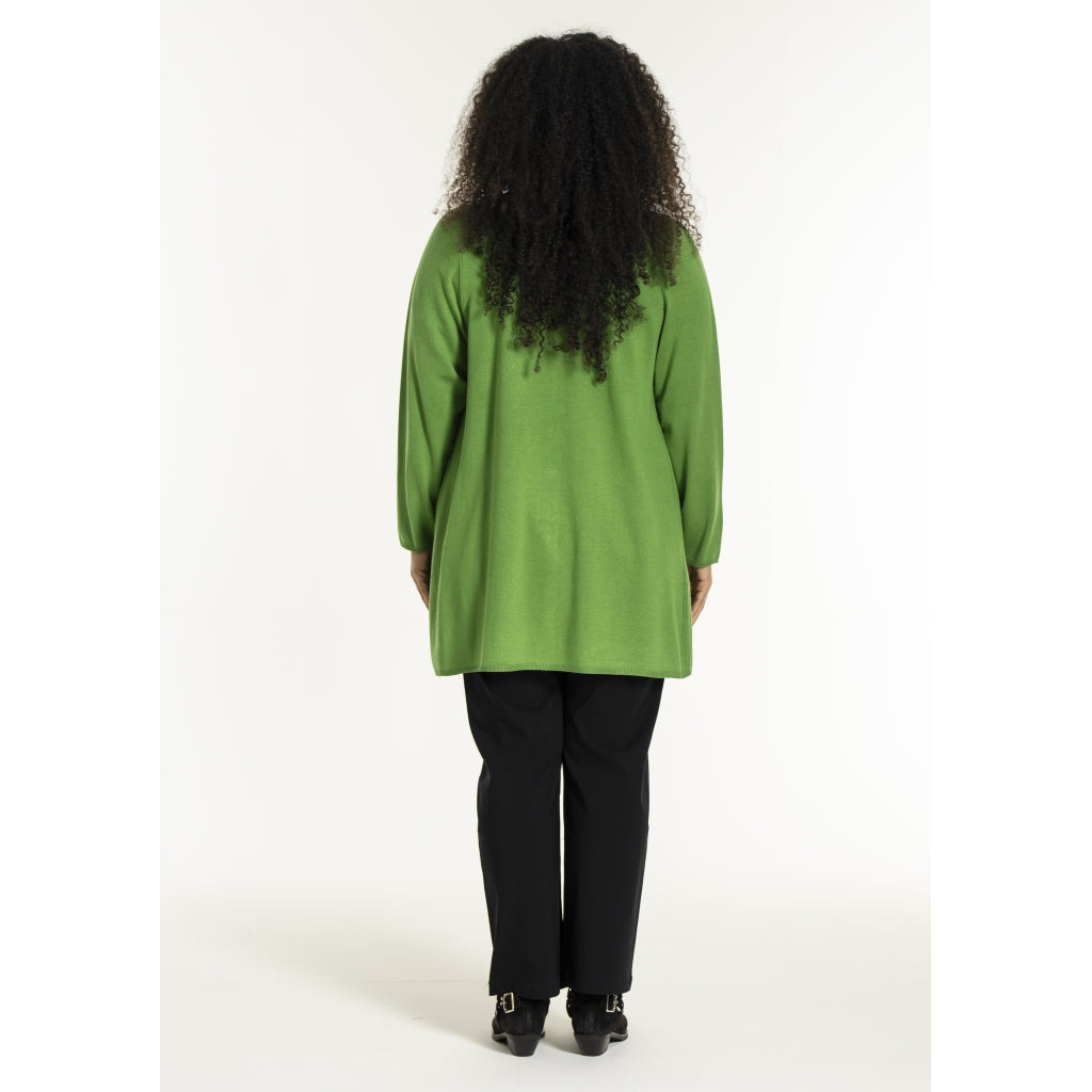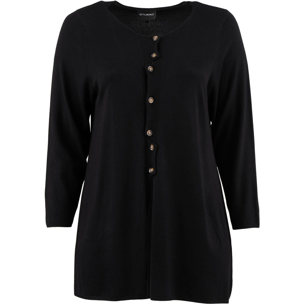 Feminin, ensfarvet strikket cardigan med lækre detaljer. Stylen er en smule A-formet i elastisk mix af viskose og nylon. Derudover har cardiganen dekorativ gennemgående grupperet knaplukning.