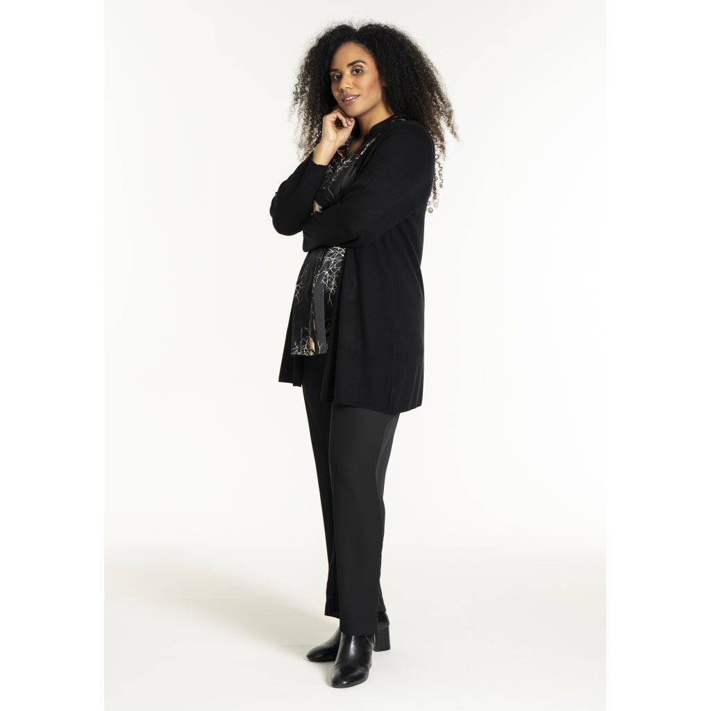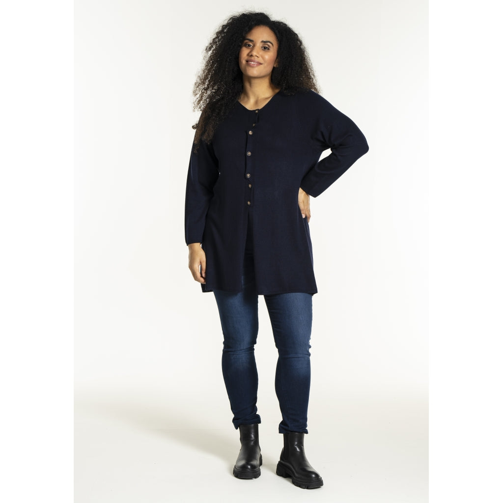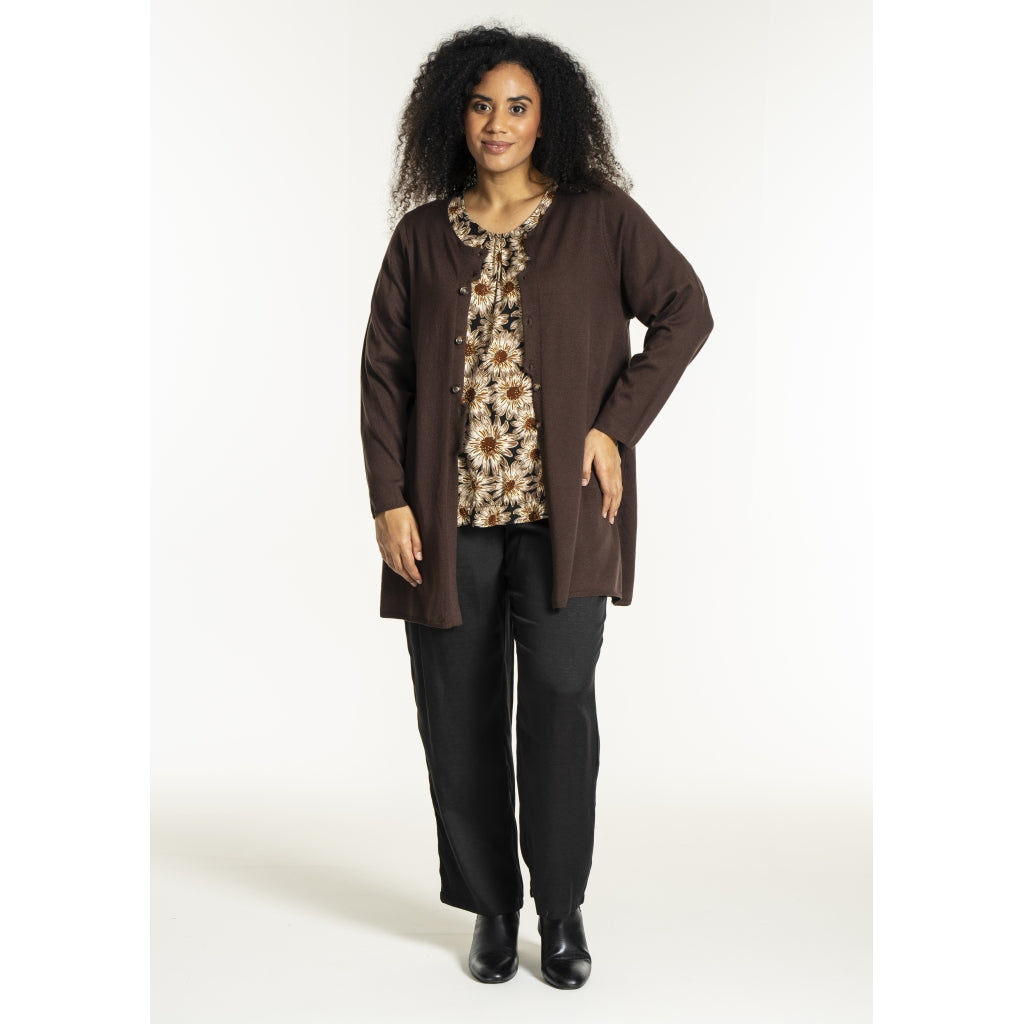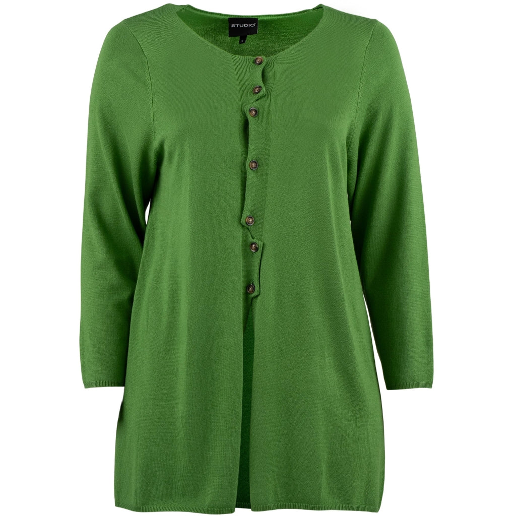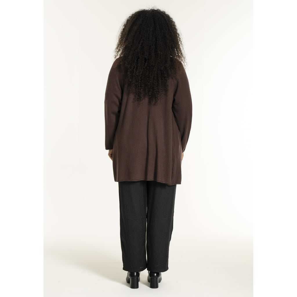 Feminin, ensfarvet strikket cardigan med lækre detaljer. Stylen er en smule A-formet i elastisk mix af viskose og nylon. Derudover har cardiganen dekorativ gennemgående grupperet knaplukning.