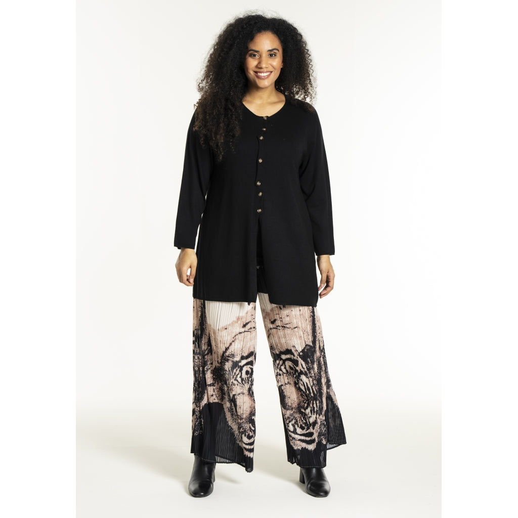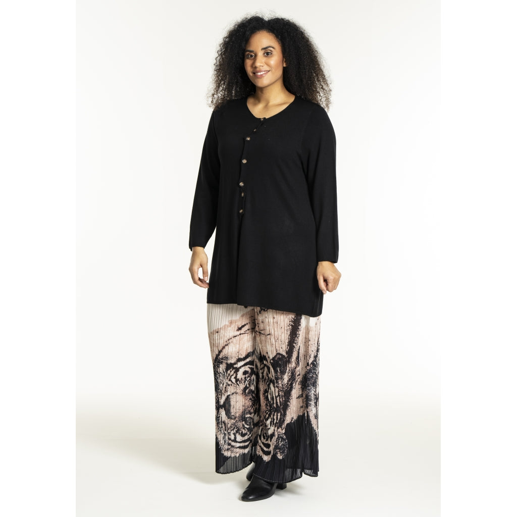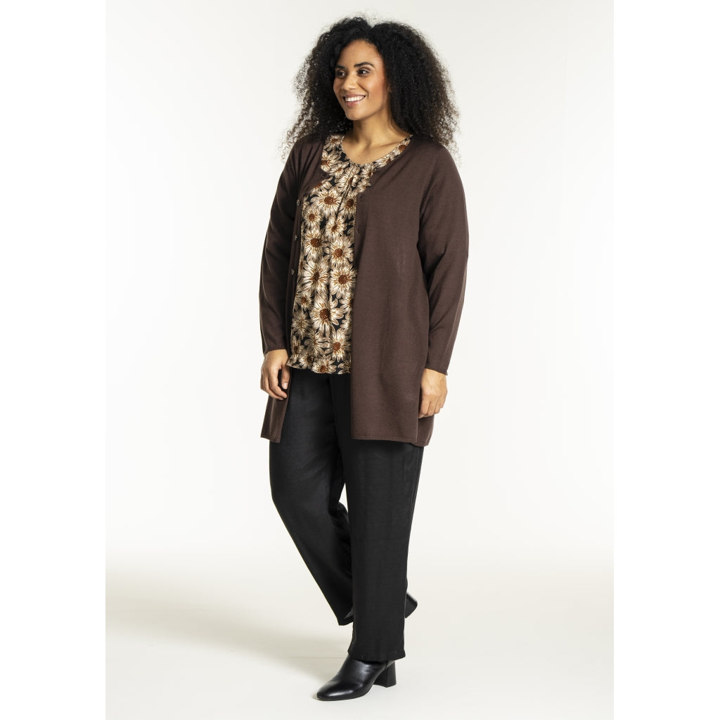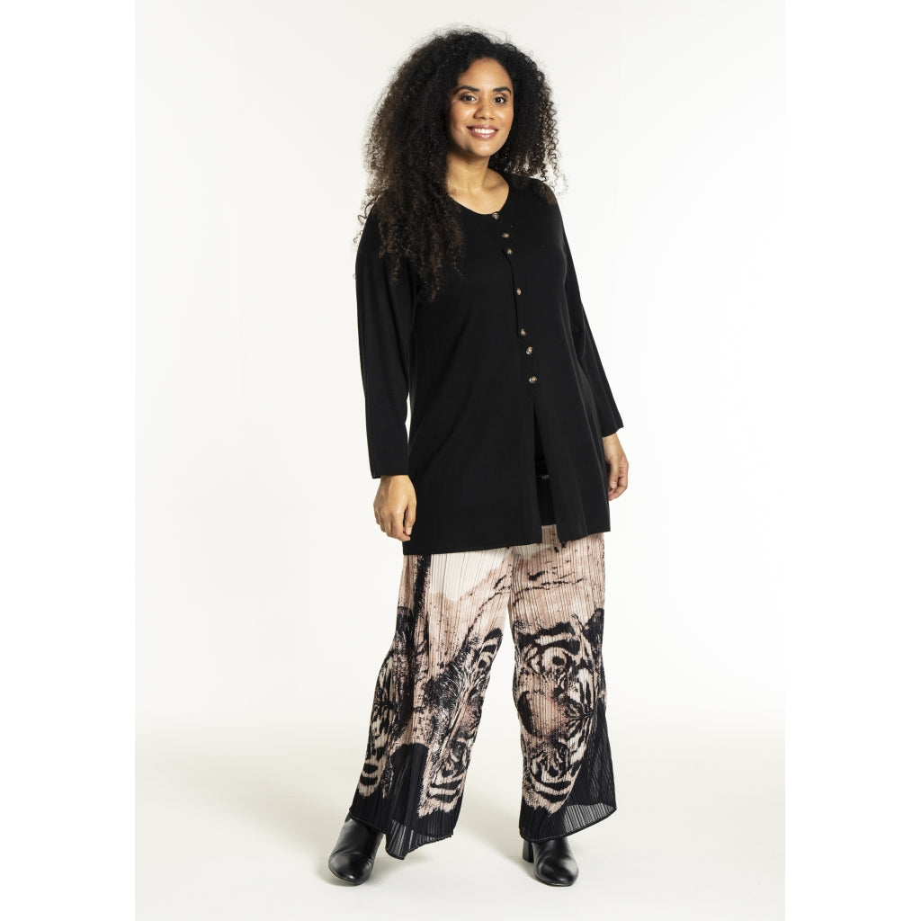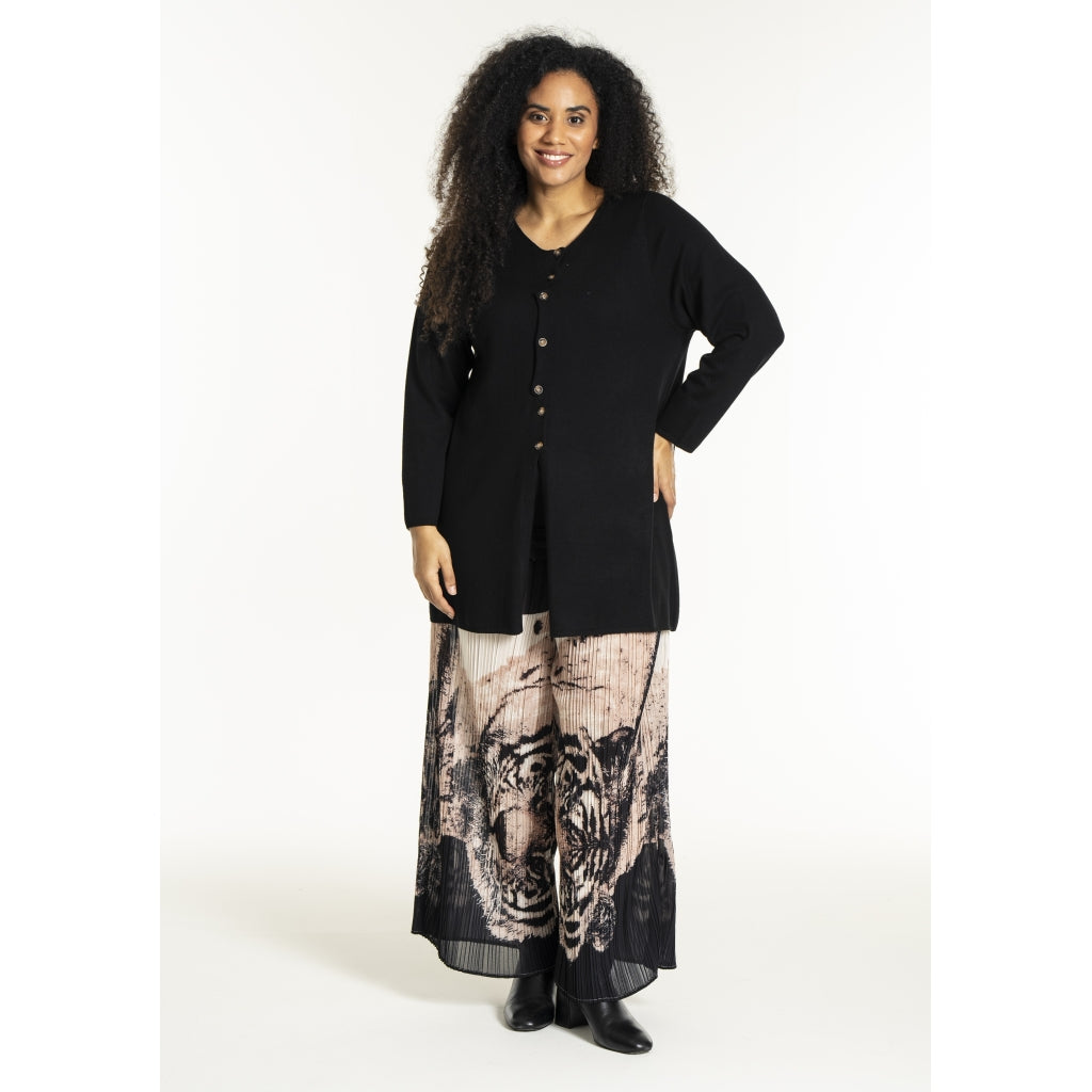 Feminin, ensfarvet strikket cardigan med lækre detaljer. Stylen er en smule A-formet i elastisk mix af viskose og nylon. Derudover har cardiganen dekorativ gennemgående grupperet knaplukning.