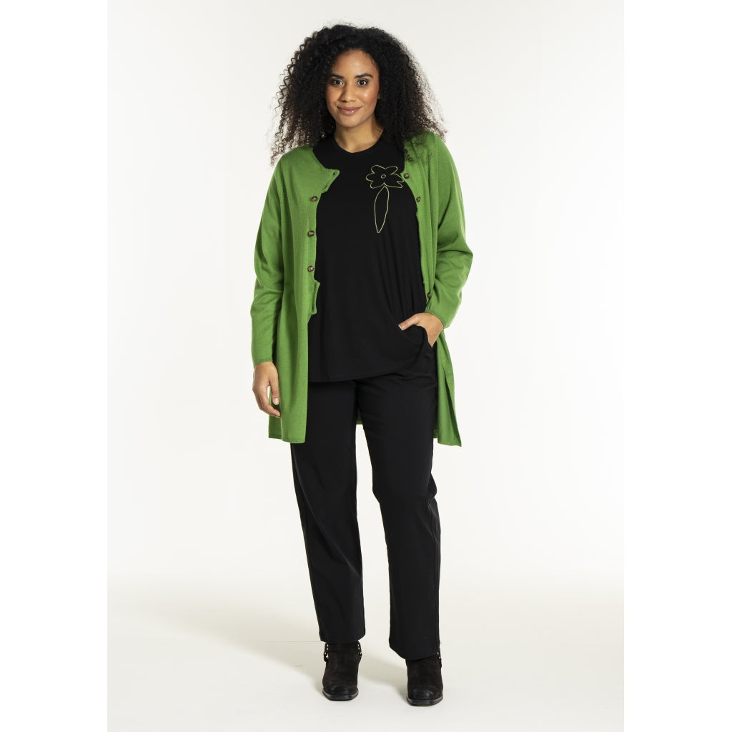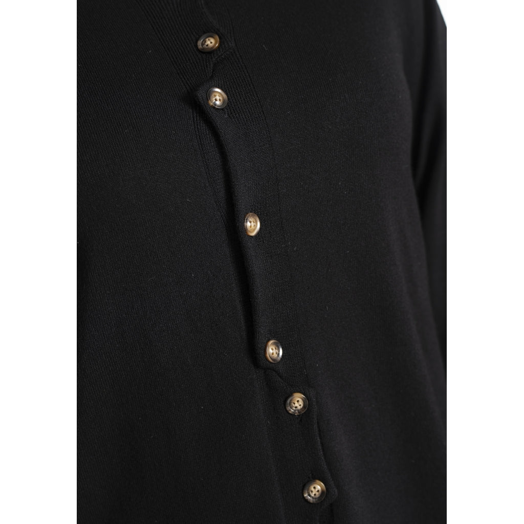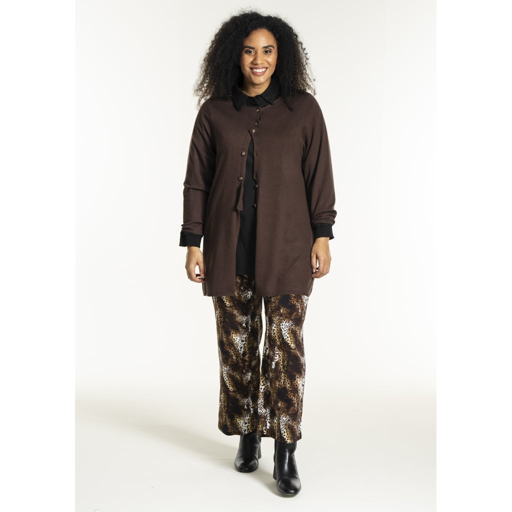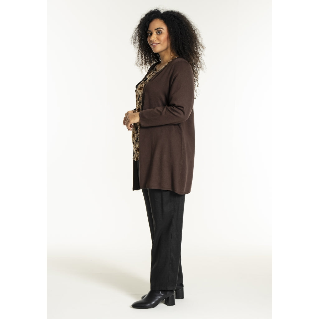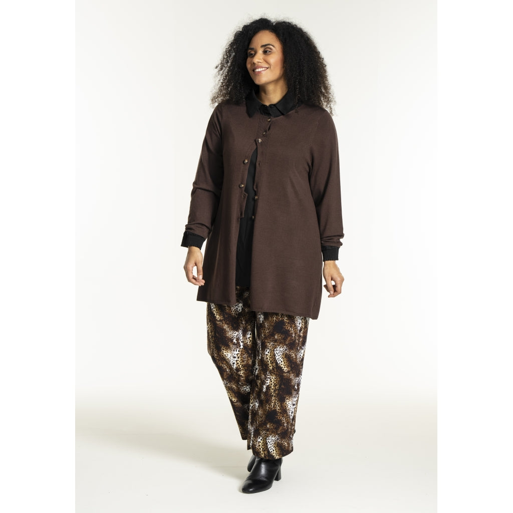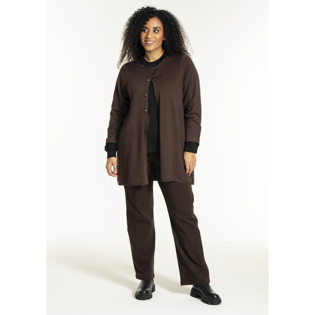 Feminin, ensfarvet strikket cardigan med lækre detaljer. Stylen er en smule A-formet i elastisk mix af viskose og nylon. Derudover har cardiganen dekorativ gennemgående grupperet knaplukning.