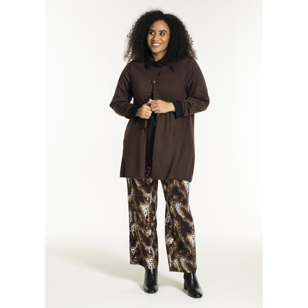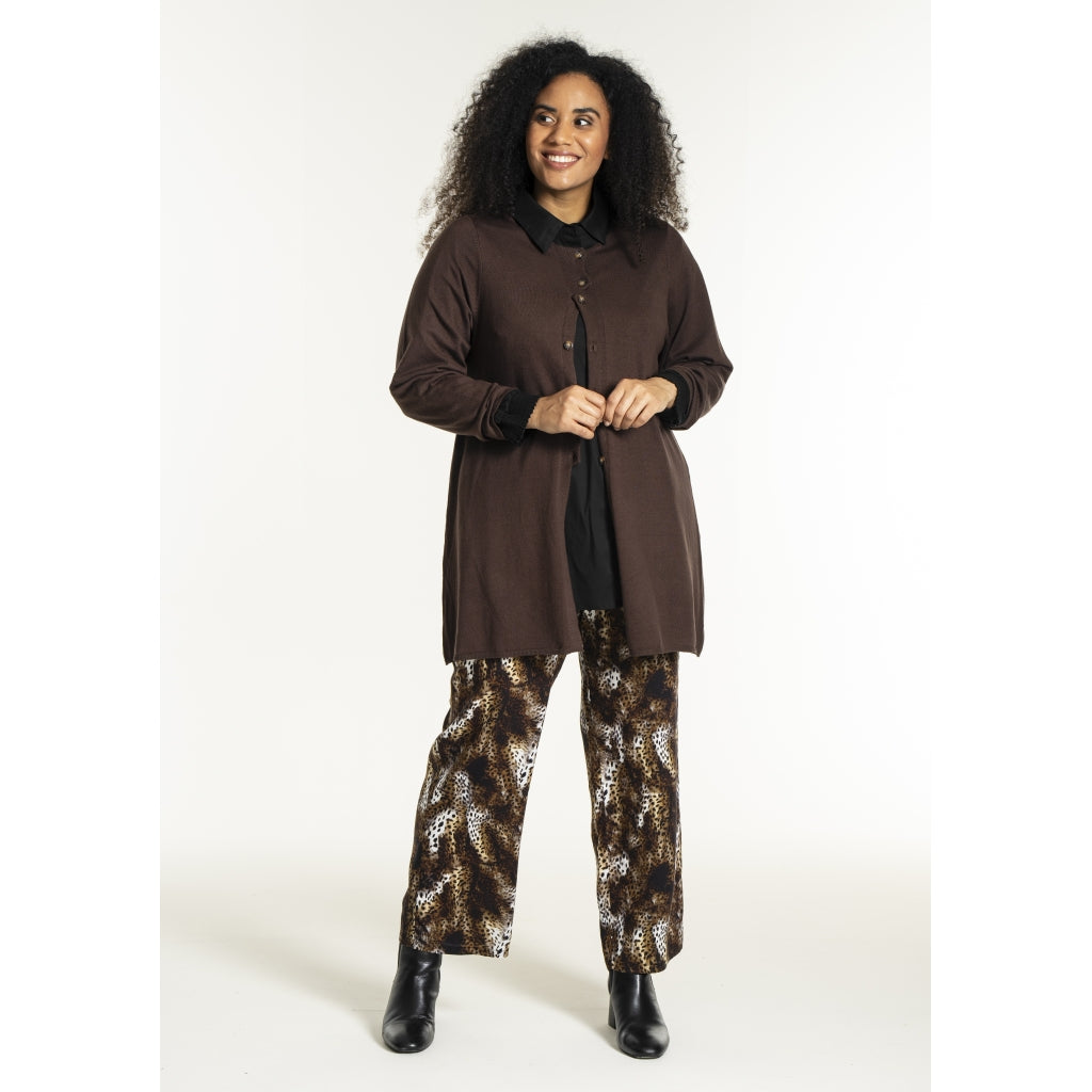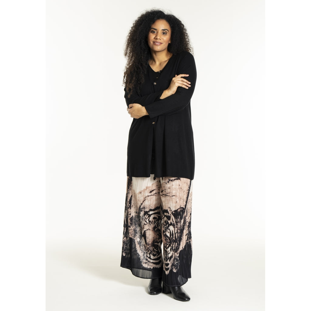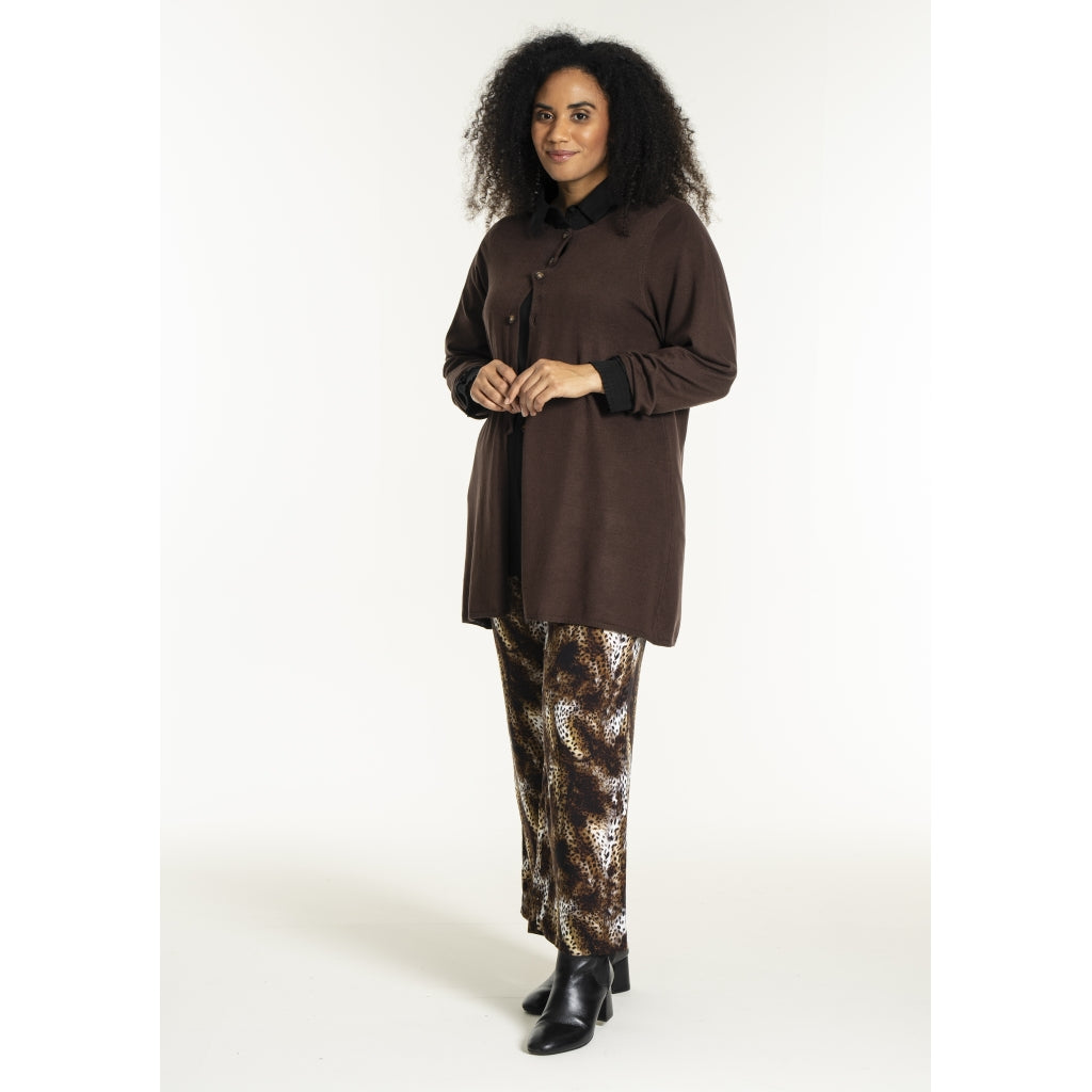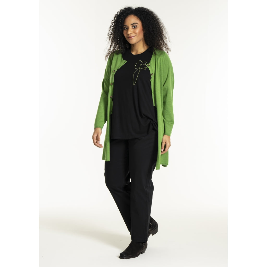 Feminin, ensfarvet strikket cardigan med lækre detaljer. Stylen er en smule A-formet i elastisk mix af viskose og nylon. Derudover har cardiganen dekorativ gennemgående grupperet knaplukning.