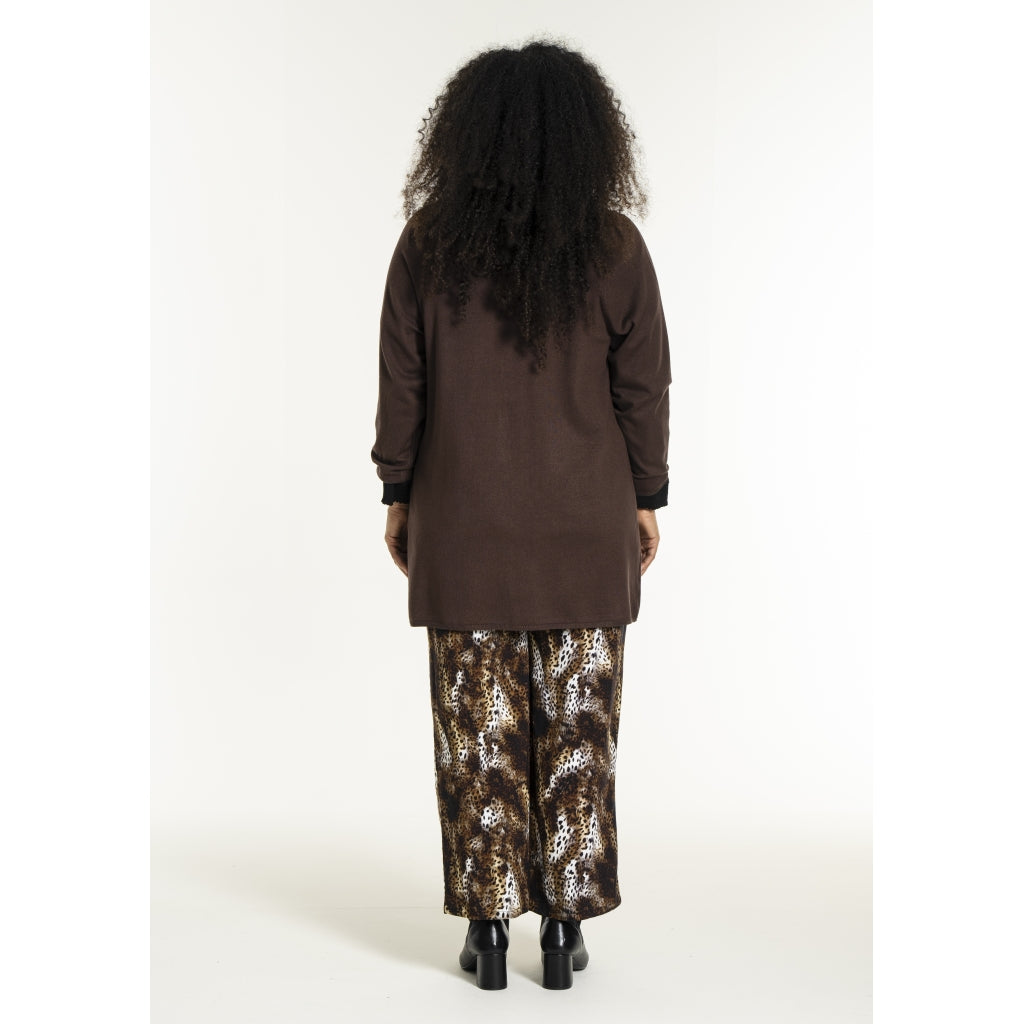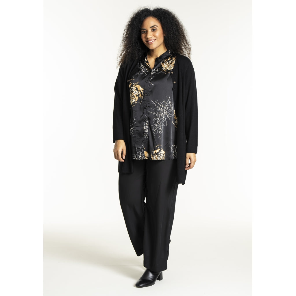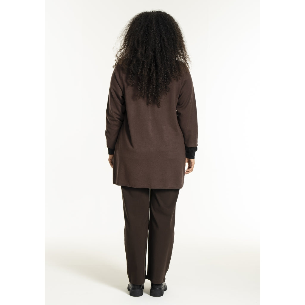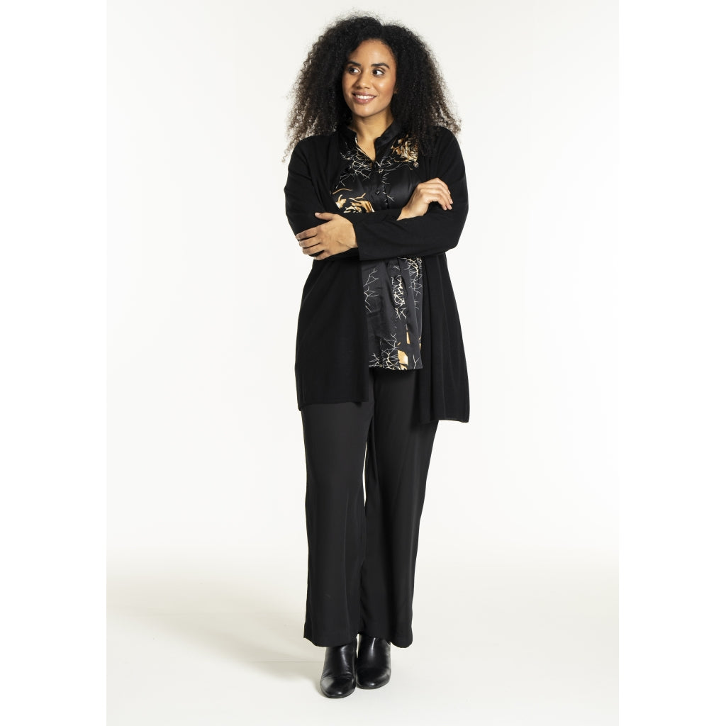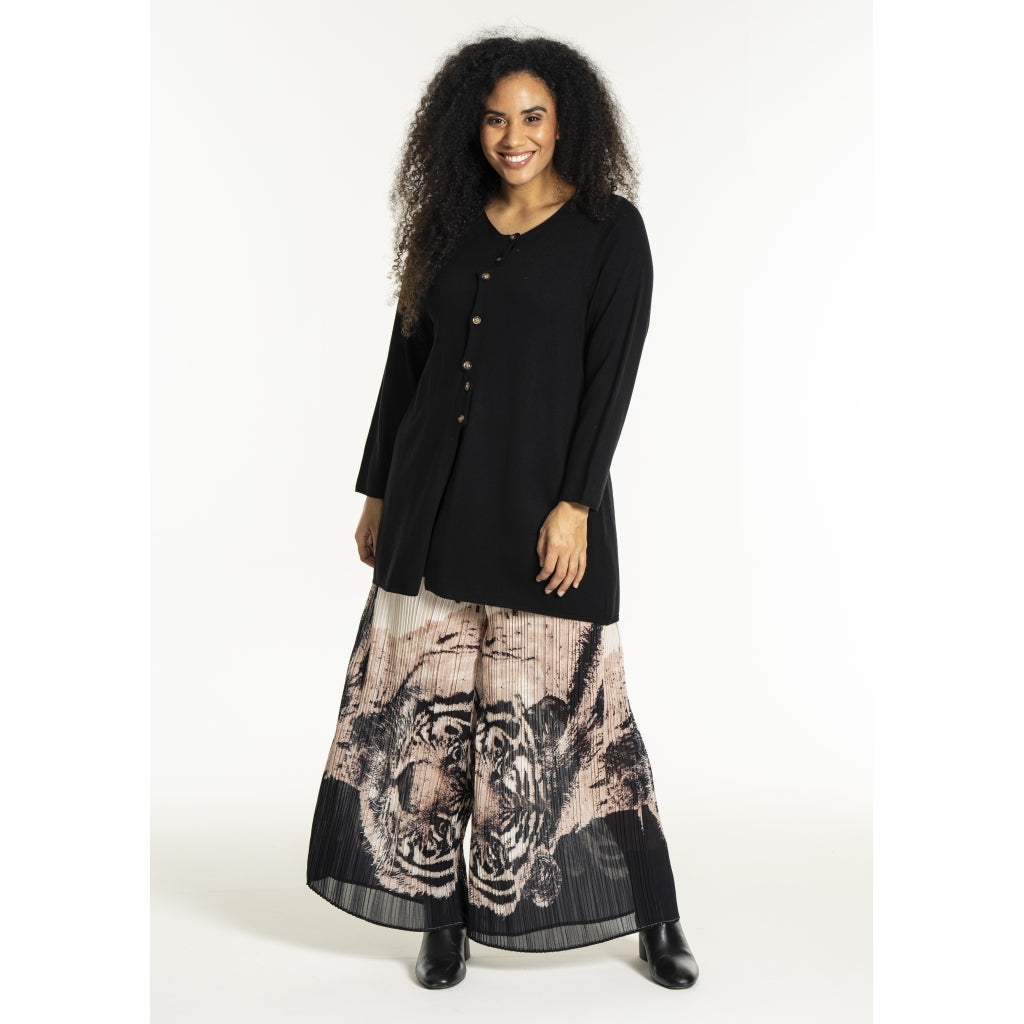 Feminin, ensfarvet strikket cardigan med lækre detaljer. Stylen er en smule A-formet i elastisk mix af viskose og nylon. Derudover har cardiganen dekorativ gennemgående grupperet knaplukning.